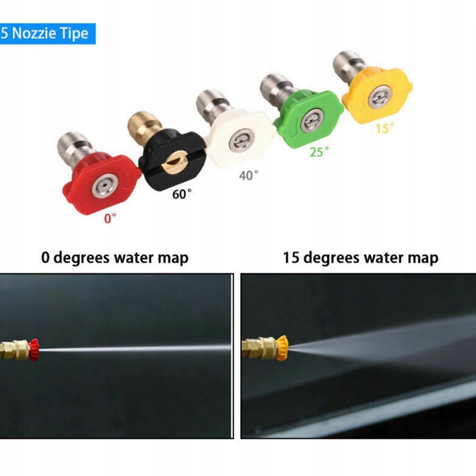 5 насадки для розпилення: насадка, червоний кінець насадки (0 градусів), жовтий кінець (15 градусів), зелений кінець (25 градусів) градусів), білий кінчик насадки (40 градусів). 4