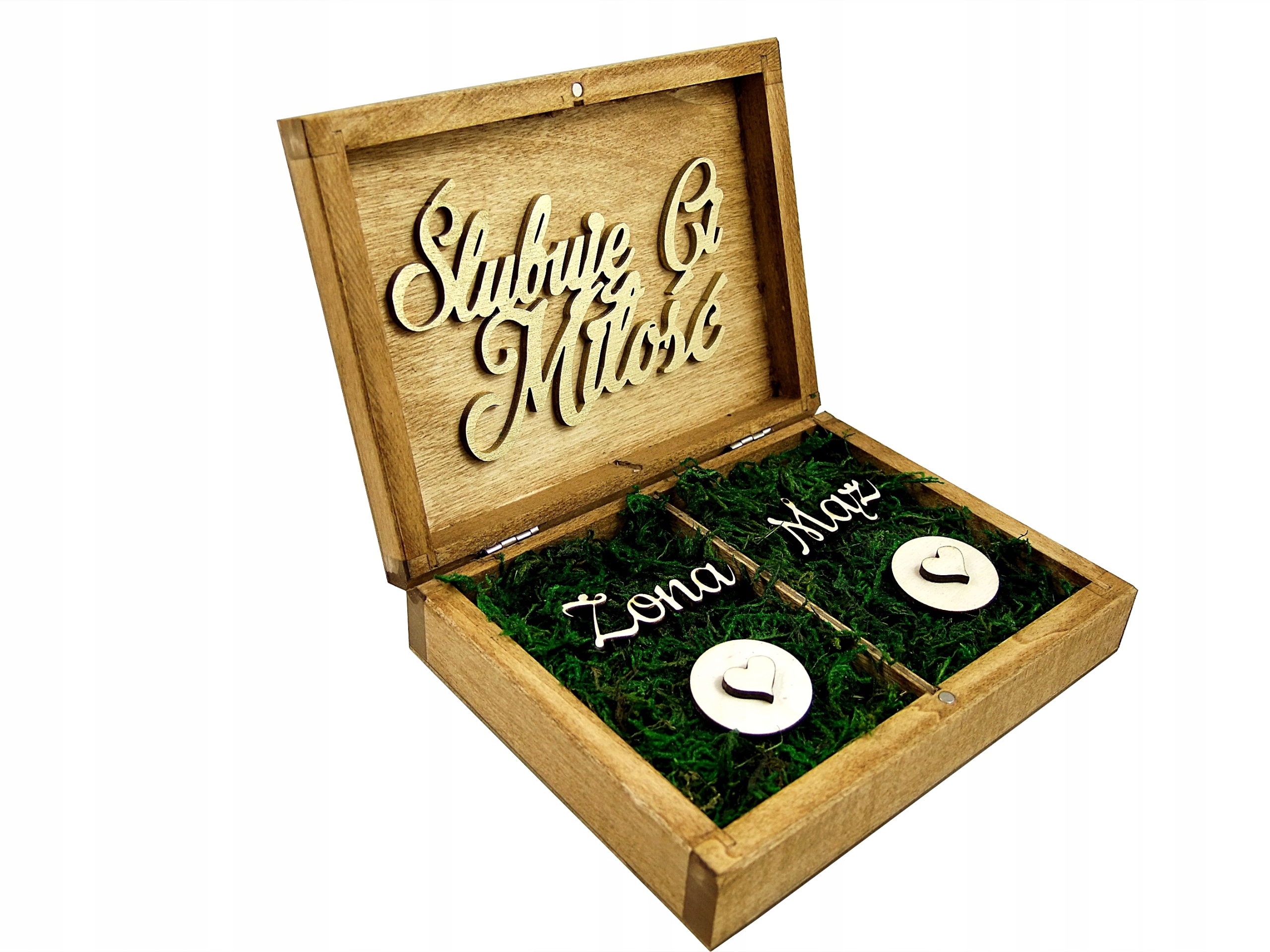 Начинка - це прекрасний зелений мох з вирізаними написами, дружиною та чоловіком та двома сердками для весільних кілець