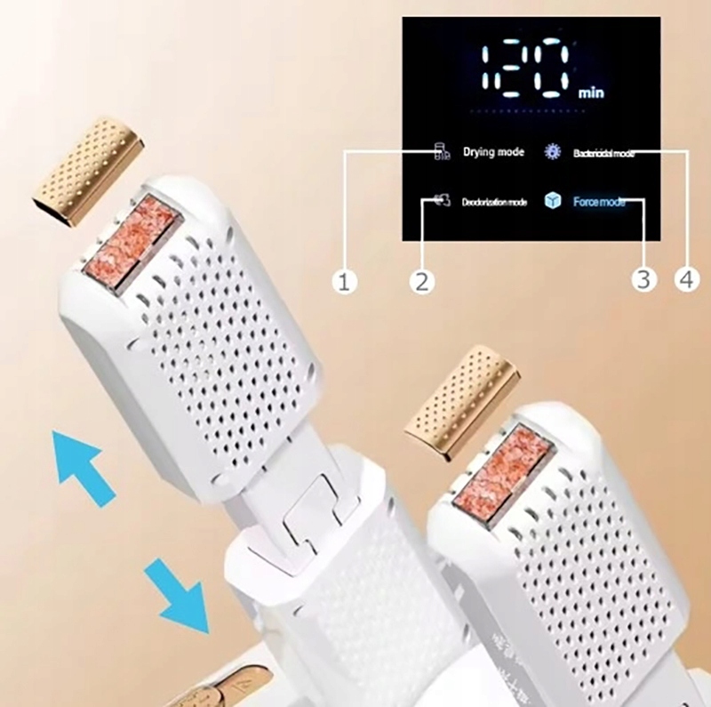 ✅trójwymiarowy Korpus Z gorącym powietrzem ma wiele otworów odprowadzających ciepło i chowane kanały powietrzne. Повітряний вихід сушарки для взуття з таймером та антибактеріальною функцією рівномірно розподіляється, а кнопки регулювання є розбірливим на перший погляд.