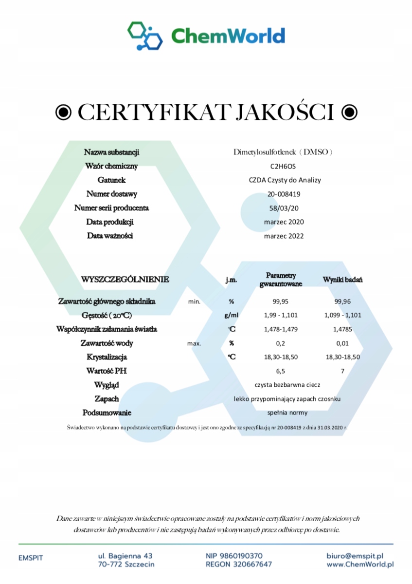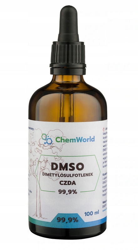 Щоб ДМСО не контактував з пластиком або металом і був захищений від сонячних променів, він упакований в спеціальну медичну пляшку з коричневого скла з терміном придатності, спеціальними методами виробництва медичного скла ДМСО зберігався в ідеальних умовах для цієї рідини. Продукт захищений оригінальною голограмою ChemWorld, яка гарантує оригінальність, чистоту та найвищу якість продукту.