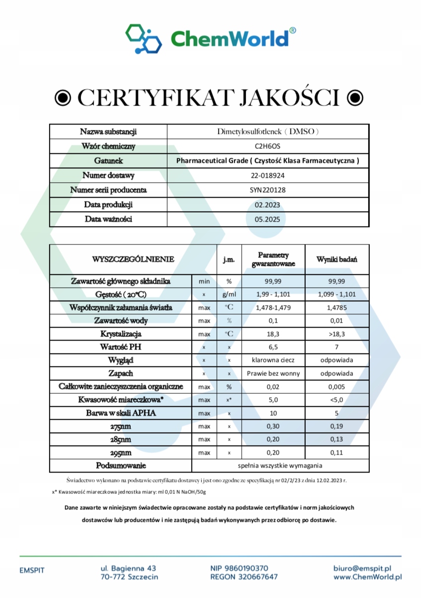 Увага!!! Наші продукти містять саме стільки мл ДМСО, як зазначено в пропозиції, тому що ми вимірюємо його в мл, а не на вагу, це дуже важливо, тому що це має велике значення, ми не вводимо наших клієнтів в оману, наші упаковки містять рівно 250 мл, 500 мл і 1000 мл ДМСО. У нас ви купуєте саме те, що вам потрібно.