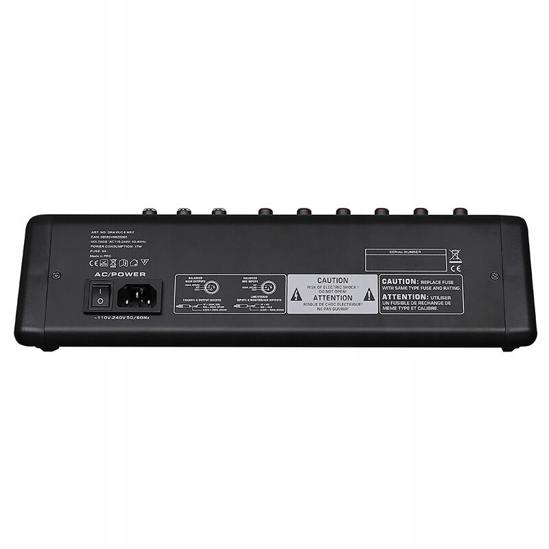 HIGH (високі): -15 - +15 дБ при 12 кГцMID (середні): -15 - +15 дБ при 2,5 кГцLOW (високі) низькі): -15 - +15 дБ при 80 кГцAUX: 0 - +15 дБFX: 0 - +15 дБFX TO AUX: 0 - +15 дБAUX SEND: 0 - +15 дБPHONE: 0 - +15 дБPAN: L/RКнопка вимкнення звуку каналу (MUTE): такMP3 плеєр: 4-кнопковий, з USB і BluetoothФункція запису (REC): такПеремикач стерео / MP3: такГрафічний еквалайзер: 7-смуговий (63 Гц, 150 Гц, 400 Гц, 1 кГц, 2,5 кГц, 6,4 кГц, 15 кГц) з діапазон корекції від -12 до +12 дБDSP-процесор: 32-розрядний, 99 мультиефектів (Hall, Room, Delay, Ping Pong, Echo, Echo Reverb, Karaoke, Pitch, Chorus, Tremolo, Flange, Auto Tune)Фейдери: 60 ммРозміри пристрою: 33 x 35,5 x 8,7 смРозміри упаковки: 38,5 x 15 x 43,5 смВага нетто: 2,95 кгВага брутто: 4,3 кгВиробник: DNA
