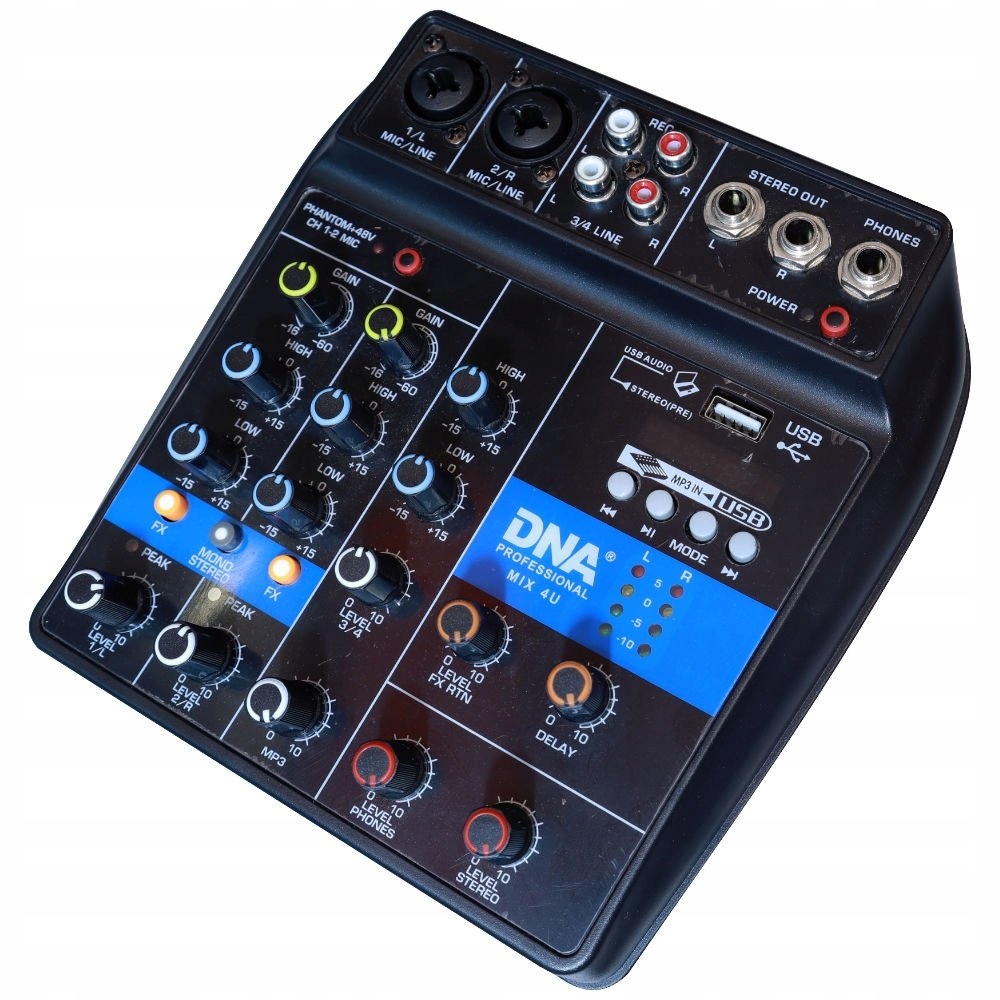 DNA MIX 4U – це легкий і дуже маленький аналоговий сценічний мікшер, який підтримує стандарт бездротового зв’язку, оснащений портом USB, підтримкою файлів MP3 і +48 В фантомне живлення. Пристрій підтримує 4 канали. Має 2 комбінованих сигнальних входу XLR/jack, які завдяки спеціальному перемикачу можуть працювати в монорежимі або як один стереоканал, а також стереороз'єм RCA (cinch) для каналів 3 і 4. Користувач може контролювати рівень гучності. кожного каналу використовуйте 2-смуговий еквалайзер для високих і низьких тонів, а також підсилюйте сигнал на входах 1 і 2. Крім того, аудіомікшер має вбудований ефект затримки, частоту і рівень якого можна легко контролювати. на заданому каналі. Вихідний сигнал можна подавати на динаміки або контролювати в навушниках. Найсильнішою стороною цього звукового мікшера є порт USB із вбудованим MP3-плеєром, який дозволяє підключати ноутбук, зовнішні карти пам’яті чи інші пристрої, які надсилають аудіосигнал на консоль.