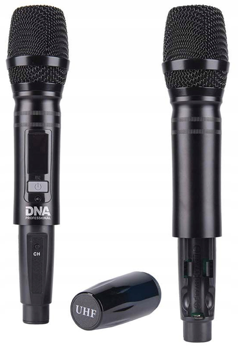 Набір із звуковим мікшером DNA включає 2 динамічні бездротові мікрофони з перемикачем і РК-дисплей, на якому відображається поточний канал, робоча частота та стан заряду акумулятора. Кожен передавач живиться від 2 батарейок типу АА по 1,5 В, які забезпечують роботу мікрофонів до 6 годин. Їх великий радіус дії, широка смуга пропускання та тривалий час роботи роблять їх ідеальними для будь-якої ситуації.