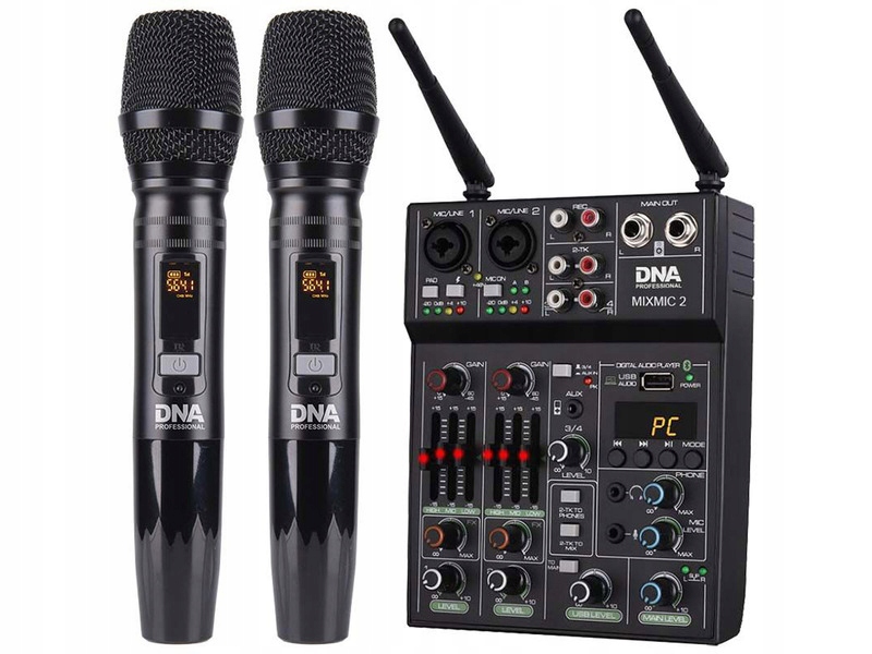 DNA MIXMIC 2 — надійний, компактний, 5-канальний аудіомікшер із вбудованим приймачем UHF хвиль, у комплекті з двома бездротовими динамічними мікрофонами. Широка смуга пропускання і великий діапазон передачі сигналу роблять набір ідеальним для використання на музичній сцені, під час різноманітних заходів, шоу та презентацій, а також у басінг-інсталяціях і вуличних виставах.