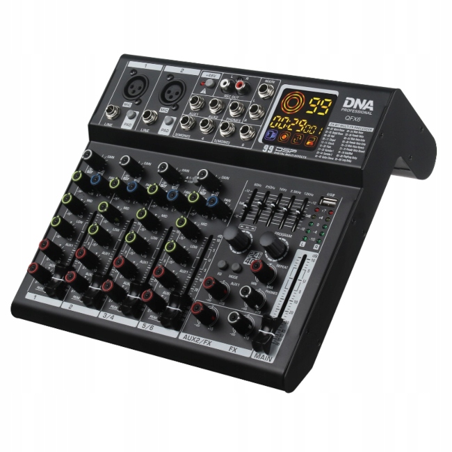 DNA QFX6 - професійним аналоговим звуковим змішувачем, оснащеним шістьма моно вхідними каналами, виходом навушників (6,35 мм гнізда), двома випускними допоміжними виробами, виходом навушників (6,35 мм гнізда) , Два виходи (CINCH/RCA), Панорама сигналу каналу, Phantom +48 В живлення, USB-B-роз'єм для підключення до комп'ютера, процесора DSP та інтуїтивного MP3-програвача ✅. Обладнання ідеально працює як сценічний змішувач під час невеликих сценічних виступів та концертів, у репетиційних приміщеннях, а також у студії домашнього запису ✅. B> Audio Mixer,