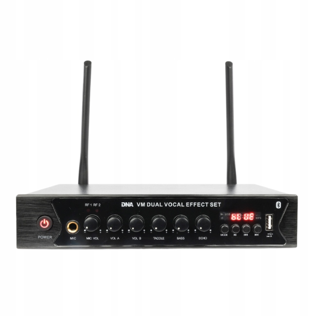 DNA VM DUAL VOCAL EFFECT SET - це високоякісна бездротова мікрофонна система на основі цифрових технологій. Набір складається з двох бездротових мікрофонів і невеликого компактного FM-приймача з портом USB і вбудованим програвачем аудіофайлів, регульованим ефектом реверберації і підтримкою Bluetooth. Ідеально підходить як звукова система для весільного оркестру, івент-компаній, ігрових аніматорів, набору мікрофонів для караоке, а також для різного роду культурно-освітніх установ.