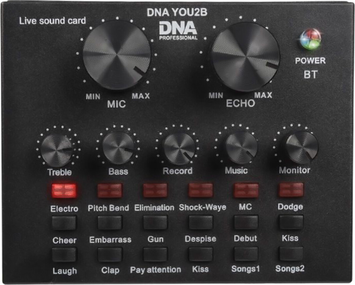 Audio DNA interface You2B has been equipped with Bluetooth service , thanks to which we can connect with it via our smartphone , tablet , tablet laptop or other device sending Аудіо -сигнал, а також 12 кнопок, які викликають звукові ефекти в режимі реального часу . Це, наприклад, Крім того, обладнання пропонує десятки ефектів звукової модуляції , а також дволайн -корекція кольору . Обсяг введення сигналів може бути незалежно контрольованим за допомогою зручності , поворотні потенціометри . окремо контрольований Існує також основна суміш та рівня застосування на сигналі ефекту Echo , який особливо добре працює під час запису вокалу , даючи йому характерний простір .