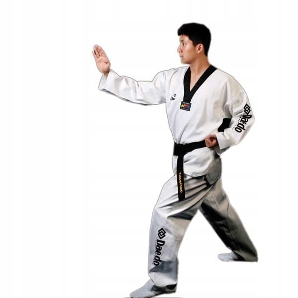 dobok, виготовлений з 65% поліестеру, 35% бавовни. Структура матеріалу - це смуга, яка чудово поводиться після миття, я ні. Крім того, ребристий матеріал дуже комфортний і дає свободу використання. У виборах на спині є чорна та червона тхеквондо та велика вишивка на лівій нозі та рукав "Даедо". Dobok має сертифікат TUE