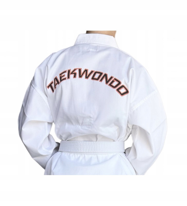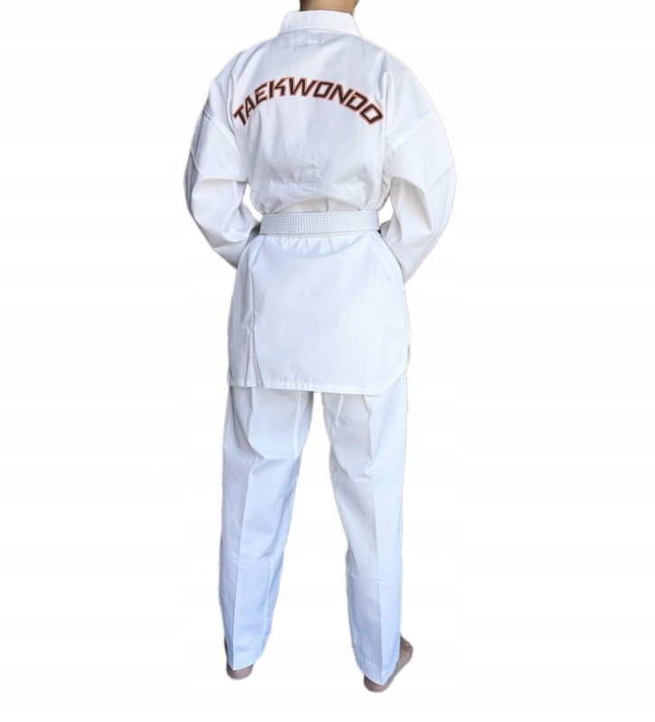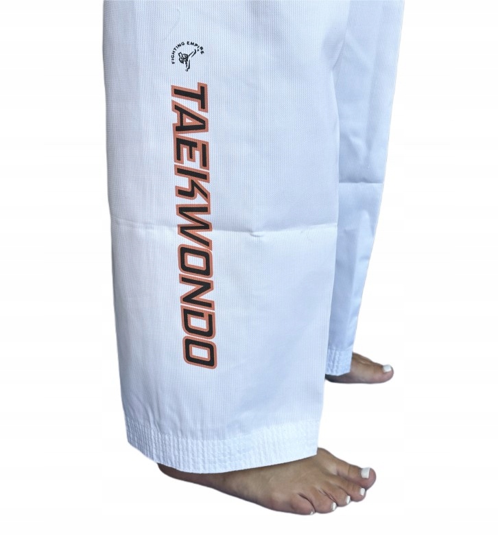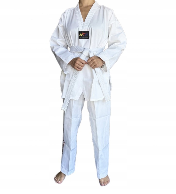 Костюм студента тхеквондо з білою складкою. Для популяризації нової моделі добків Fighting Empire ми пропонуємо надзвичайно низьку ціну на такий унікальний продукт: ми пропонуємо найдешевші смугасті добки з білим поясом в комплекті. Костюм для тхеквондо виготовлений із суміші бавовни та поліестеру. Добок традиційно вільного крою, з довгим рукавом. На спині напис тхеквондо. Ребриста структура матеріалу надає добу незвичайний характер. Штани з широкими і довгими штанинами, еластичний пояс (+ шнурок).