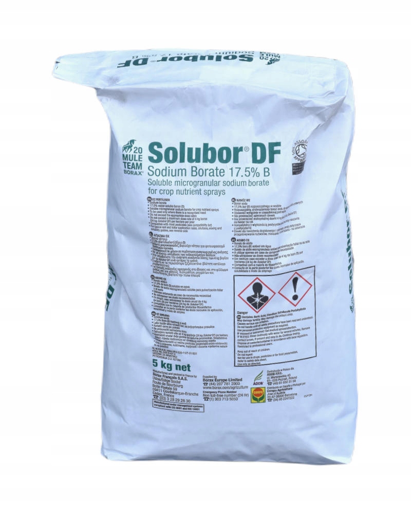 Солубор® ДФ – однокомпонентне борне добриво у вигляді мікрогранул із вмістом бору 17,5% (Б). Добриво швидко розчиняється у воді, бор, що міститься в добриві, дуже швидко і повністю засвоюється рослинами. Добриво призначене для профілактичного та екстреного підживлення сільськогосподарських, овочевих та плодових культур. Рекомендується для удобрення особливо чутливих до дефіциту бору культур, таких як ріпак, цукровий буряк, картопля, хрестоцвіті овочі, зерняткові та кісточкові, а також культур, що ростуть на ґрунтах із низьким вмістом бору.