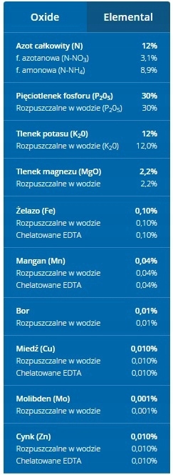 Склад:Загальний азот 12%, п'ятиокис фосфору 30%, оксид калію 12%. Усю композицію можна знайти пізніше на аукціоні.