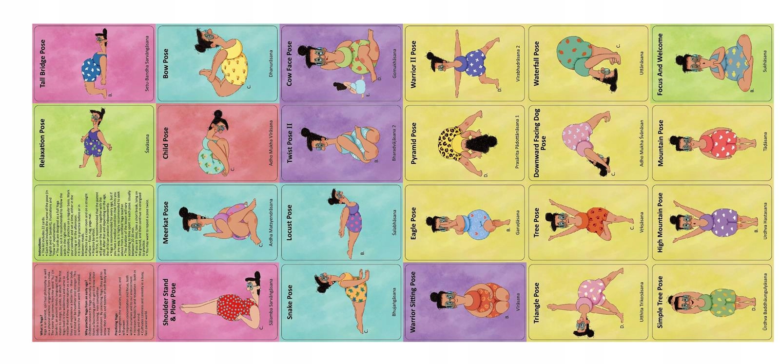- кожна картка містить назву предмета англійською та санскритською мовами, ілюстрацію та покрокову інструкцію;