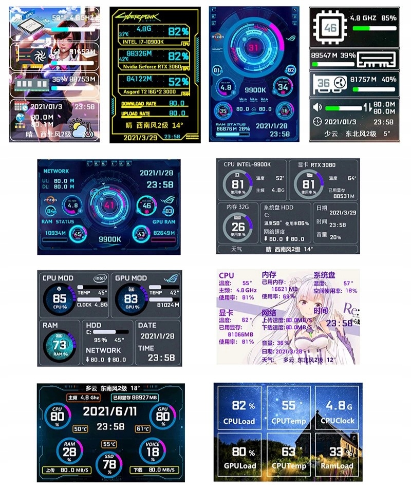 - Може відображати ЦП, ГП, дані про використання пам’яті, ОЗУ, температуру, швидкість Інтернету, дата, час, рівень гучності, прогноз погоди тощо