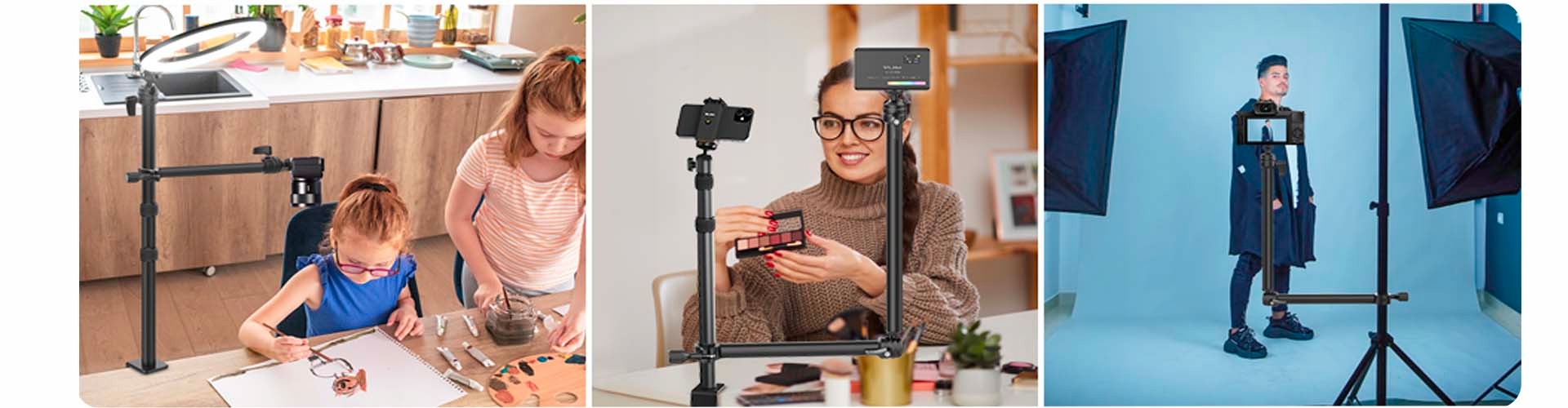 Універсальний штатив, завдяки якому можна розмістити лампу, камеру, мікрофон. Довгий кронштейн дозволяє розташувати обладнання як завгодно. Ви можете розташувати на ньому камеру, наприклад об’єктивом вниз або над нотатками чи екраном комп’ютера.
