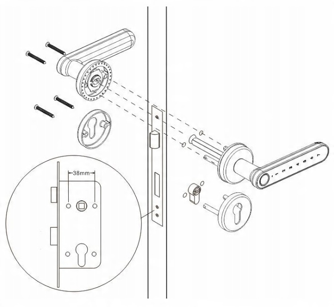 3: Прикріпіть ручку, як показано на малюнку. Не забувайте встановити ручку з кодовим замком і сканером відбитків пальців на зовнішній стороні дверей.