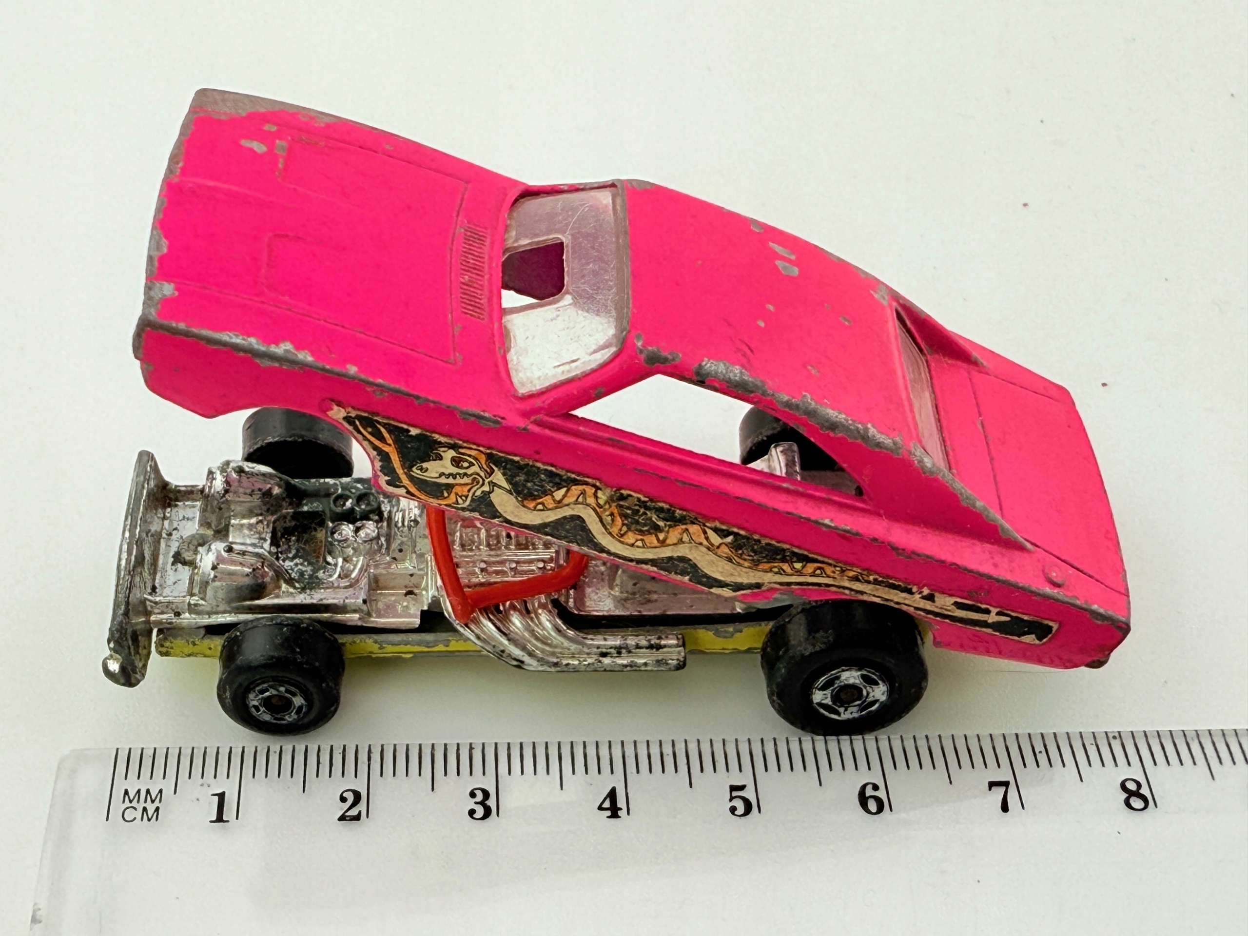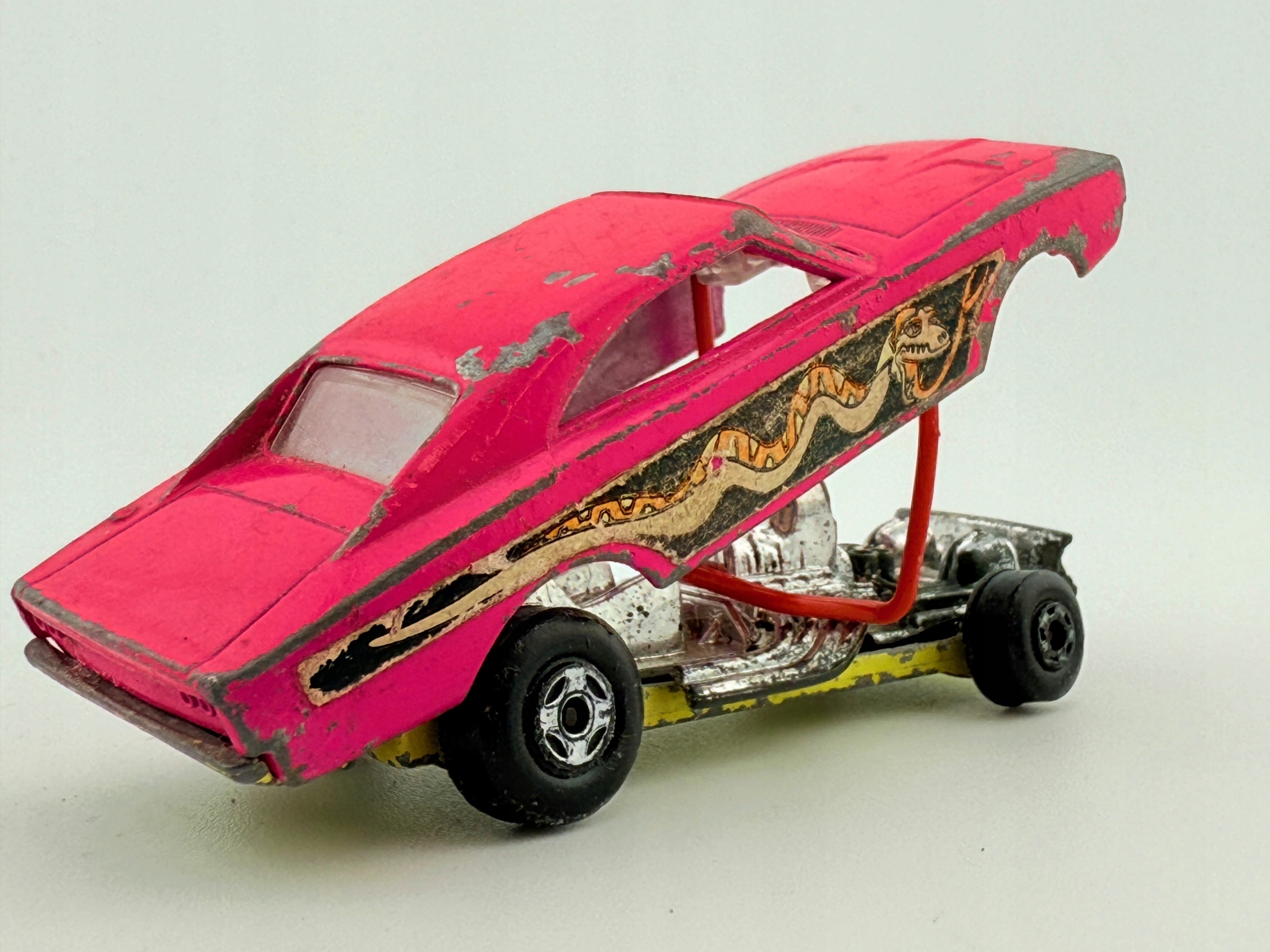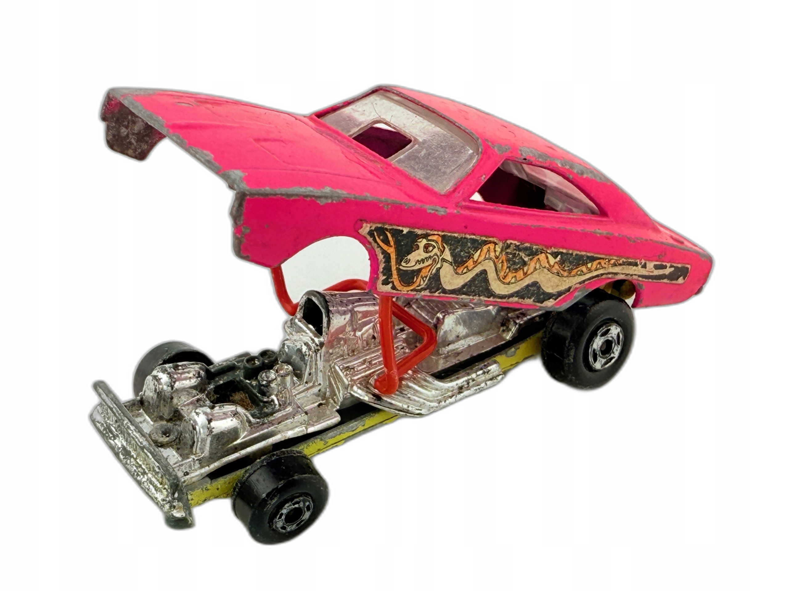 позначка: сірник • Модель: Dodge Dragster • Виробник: продукти Лесні • Масштаб: 1:64 • Умова: Використовується • Матеріал: метал + пластик • Довжина (мм): 70 • Кольори: рожевий з чорними та золотими конструкціями • Додавання: Двигун відкриття, унікальний дизайн із змією мотивом • Номер каталогу: 70 • Зроблено в: Англія