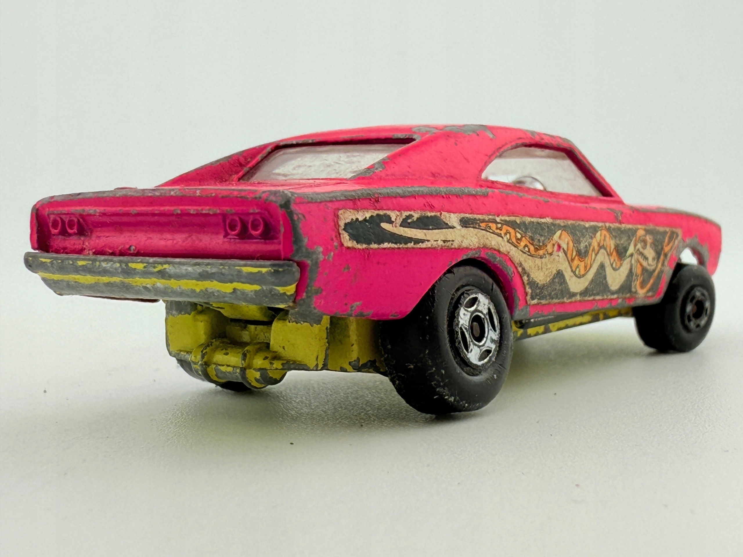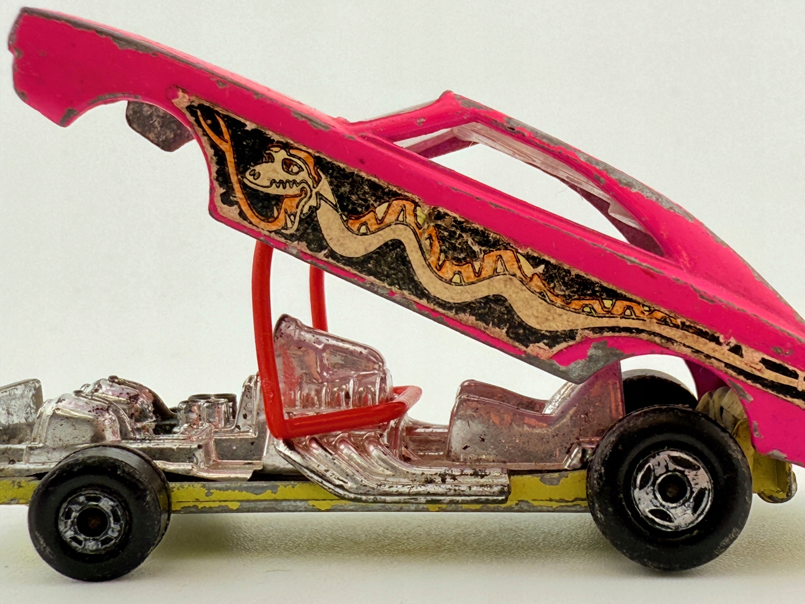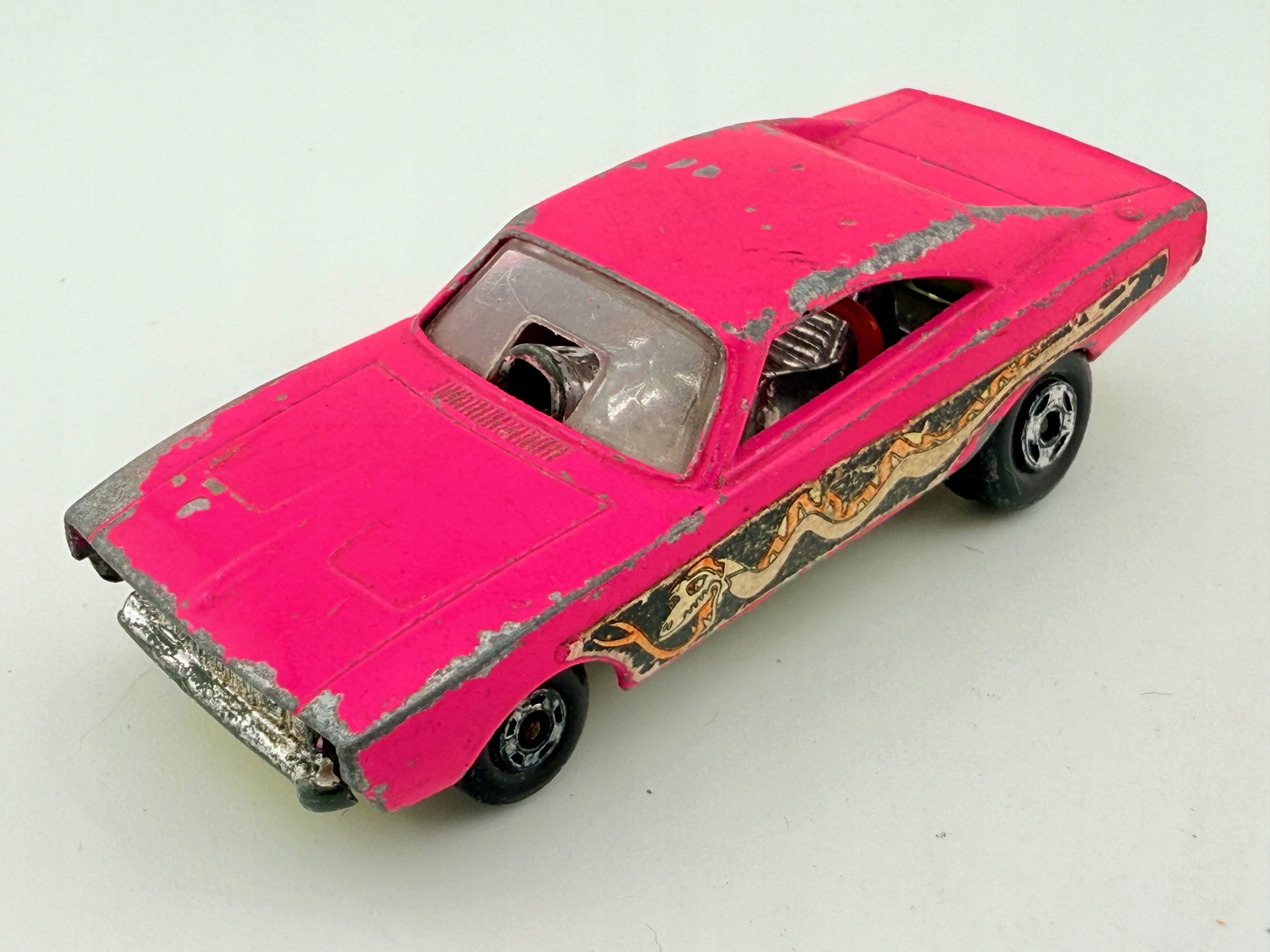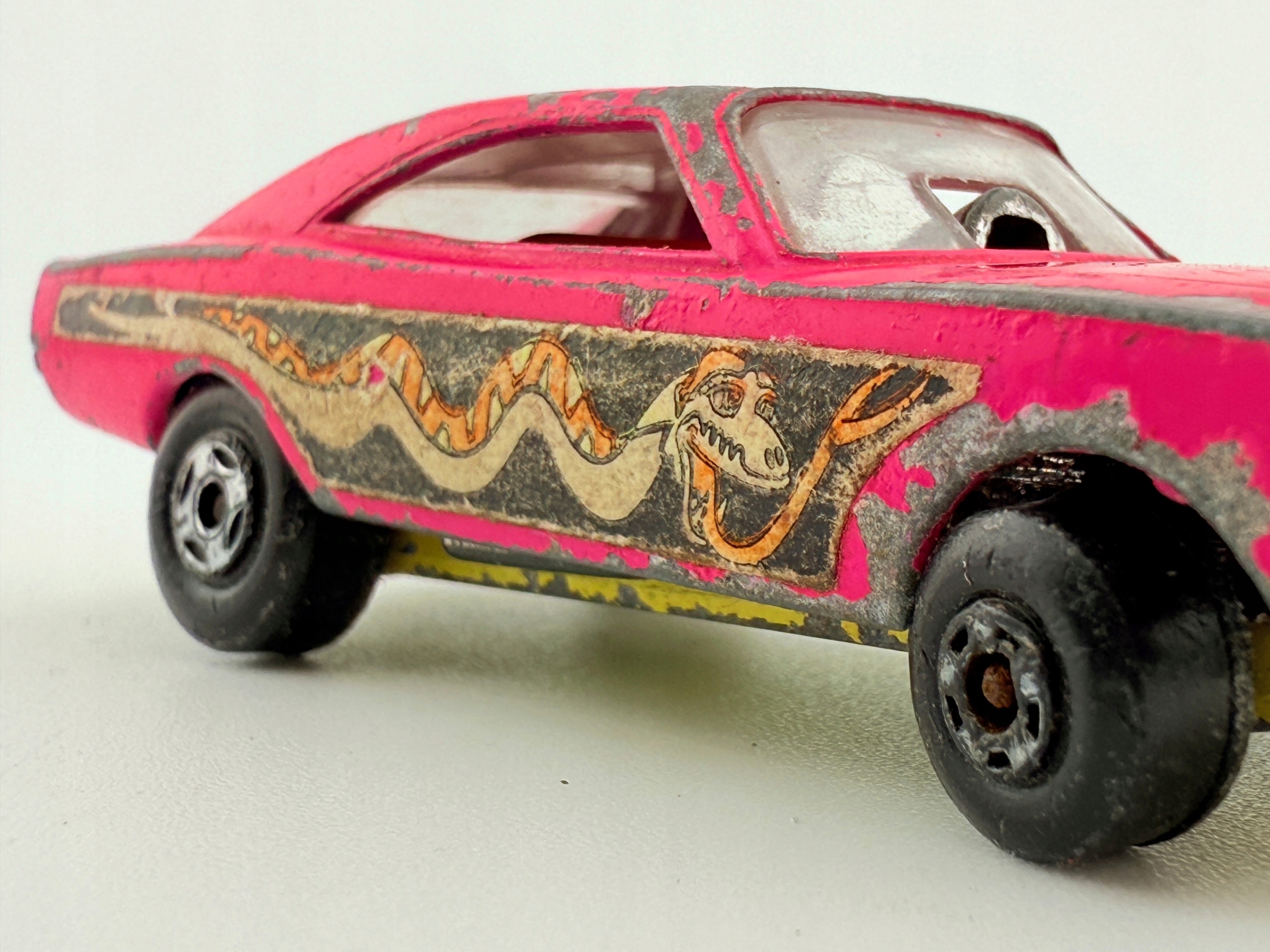 позначка: сірник • Модель: Dodge Dragster • Виробник: продукти Лесні • Масштаб: 1:64 • Умова: Використовується • Матеріал: метал + пластик • Довжина (мм): 70 • Кольори: рожевий з чорними та золотими конструкціями • Додавання: Двигун відкриття, унікальний дизайн із змією мотивом • Номер каталогу: 70 • Зроблено в: Англія