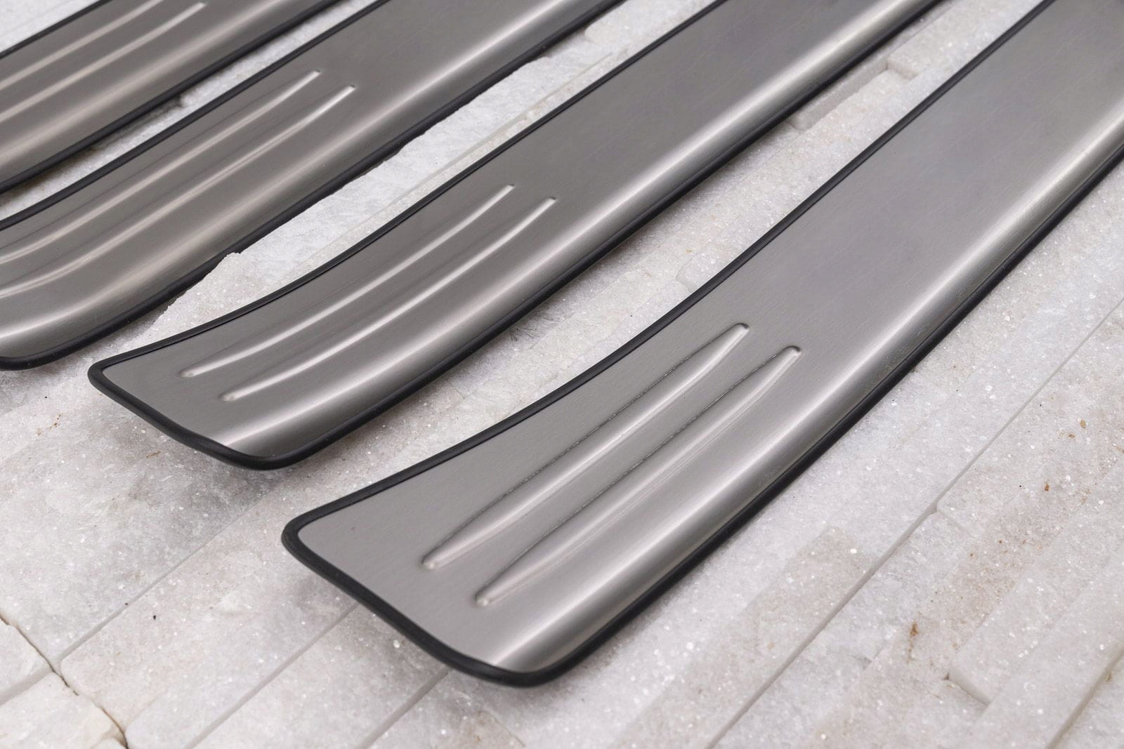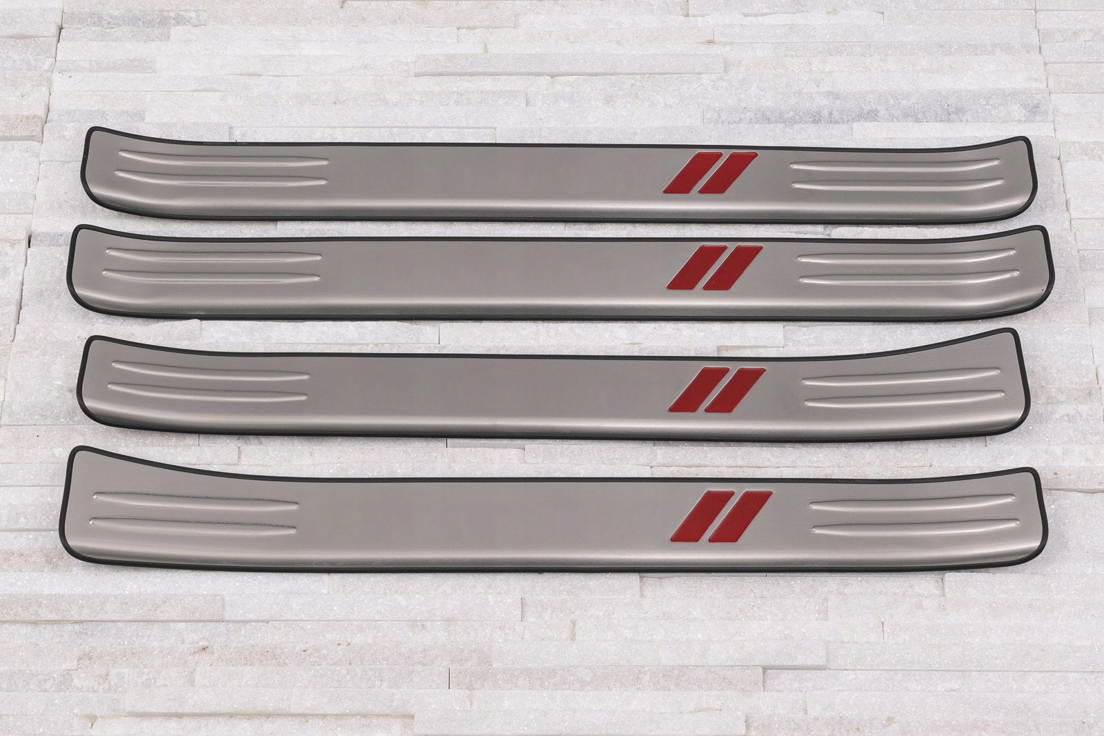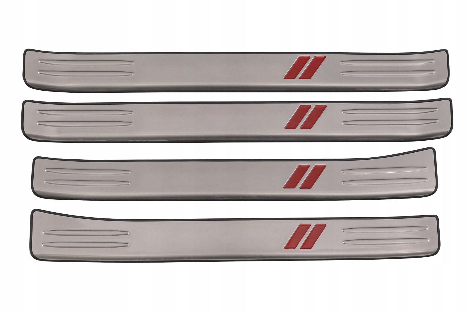 Планки кріпляться на пофарбовані частини внутрішніх порогів. Вони доповнюють внутрішню лінію дверей і надають поріжку спортивно-елегантний вигляд. Ця модель привертає увагу вишуканим поєднанням сталевих оздоблювальних ефектів: червоні лаковані деталі додають стильного блиску, а матові, матові деталі є елегантним фоном для тиснених написів DODGE, що їх прикрашають. На додаток до стильної цінності, смуги виконують захисну роль, захищаючи пороги від подряпин і пошкоджень, які можуть виникнути під час посадки та виходу з автомобіля.