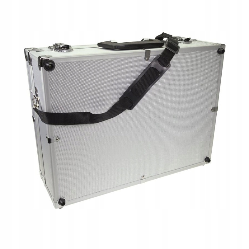 Алюмінієва валіза для фотографій із внутрішньою частиною з перфорованого пінопласту PrecutCubic. Внутрішні розміри 44х14,5х32 см, зовнішні 46х16х34 см, вага 2570 г, колір сріблястий. Міцна бризкозахищена валіза, ковані краї, застібка на 2 ключі, металеві люверси для підвішування на знімному плечовому ремені, пластикові ніжки для стояння. Внутрішня піна PrecutCubic дозволяє видаляти окремі призми, щоб отримати оптимальну форму для вставлення предмета, який ви носите.