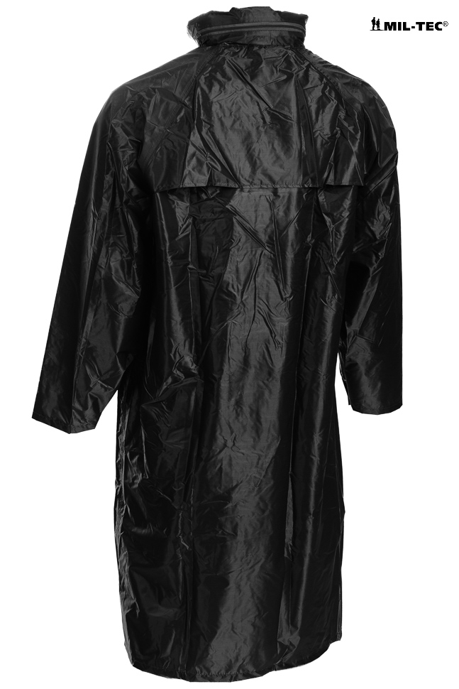 Професійний плащ - штормівка. Продукт німецької компанії Mil-Tec. Забезпечує повний захист від дощу та вітру. Дуже міцний і в той же час легкий, він займає мало місця. Виготовлений з міцного поліестеру з покриттям ПВХ всередині. Всі шви проклеєні - проклеєні термоскотчем. Високий комфорт, якого немає в інших штормових куртках, забезпечує система вентиляції. У верхній половині спини є великий сітчастий отвір. Вентиляційний отвір водонепроникний і забезпечує циркуляцію повітря. Додаткові вентиляційні отвори під руками закріплені пластиковою заклепкою. Високий комір захищає від вітру та дощу. Великий регульований капюшон захований в комірі, шнурок дозволяє регулювати розмір капюшона. Пальто оснащене місткими кишенями з клапанами. Кріпиться зручними застібками, подвійна система кріплення гарантує герметичність (дві смуги покриття). Манжети з регулюванням обхвату застібками. Транспортний чохол у комплекті.