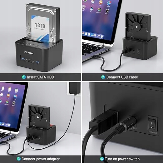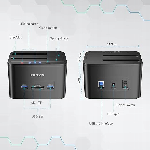 - 【Універсальна сумісність】 Fideco SATA HDD Док-станція є універсально сумісною з Windows XP/Vista/7/8.1/10/Mac OS/Linux. Переконайтесь, що він підтримує лише жорсткі диски/SSD. Офлайн -клонування! Просто вставте 2 жорсткі диски у відповідні поглиблення станції і натисніть кнопку "клонування" протягом 5 секунд, поки світлодіодний індикатор не почне спалахувати. Клен може бути завершений без використання комп'ютера! 4 Контролер та встановлення без використання інструментів абсолютно потрібні. 4 Передача даних ніколи не була такою простішою завдяки його використанню. Ви також можете використовувати його для підключення миші, клавіатури тощо. Це ваша багатофункціональна док -станція!