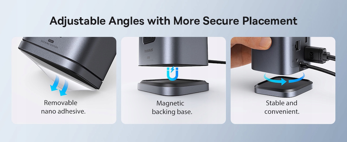 Компактна вертикальна док-станція для ноутбука з елегантною алюмінієвою обробкою, 80 см кабелем і магнітною основою змінює ваше робоче місце. Вертикальне розширення простору забезпечує більший робочий діапазон на вашому столі.