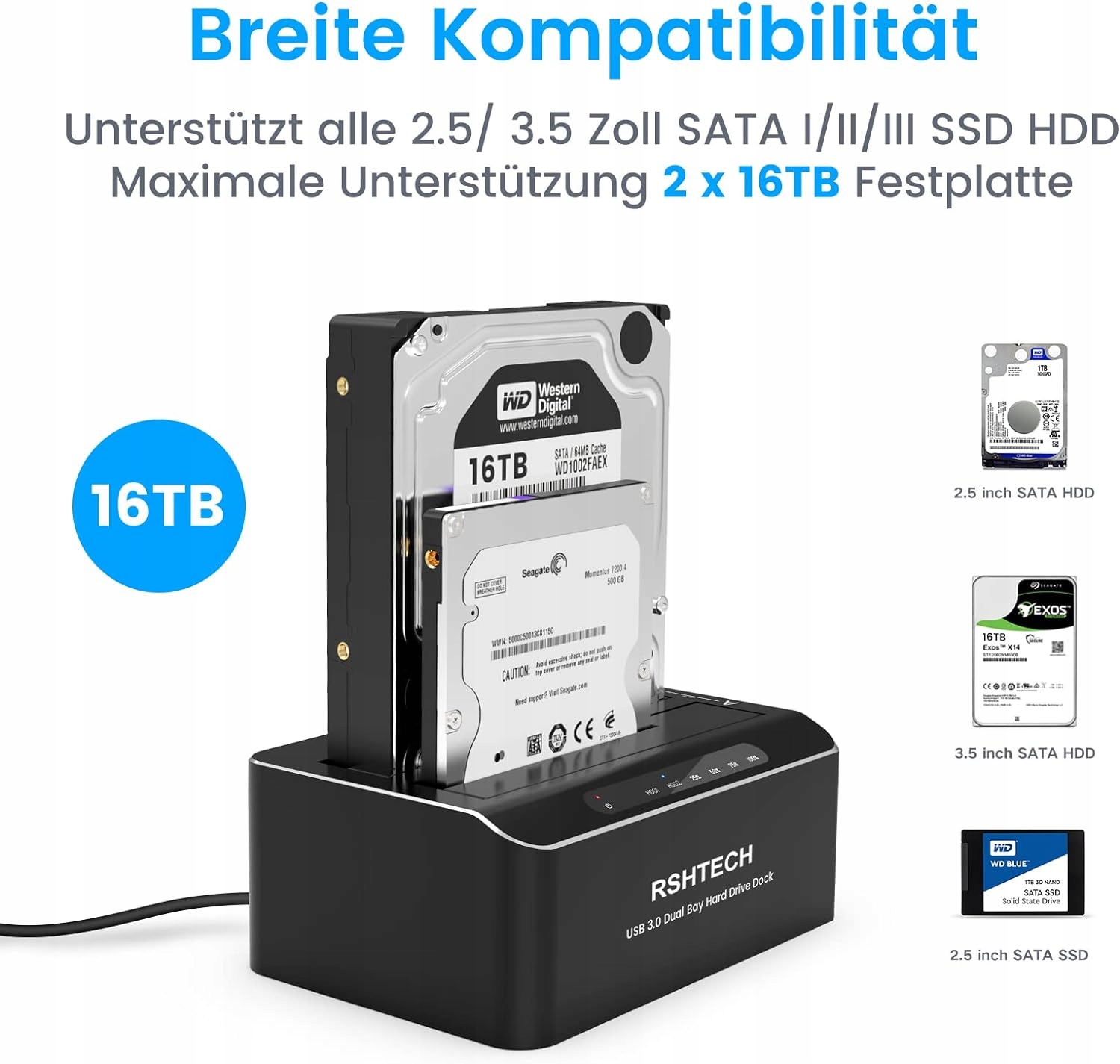 Док-станція RSHTECH для жорстких дисків, USB 3.0, алюмінієва док-станція для автономних жорстких дисків до 2,5 і 3,5 дюймів SATA HDD SSD, підтримує 2 x 16 TB, без інструментів (RSH-DS01)