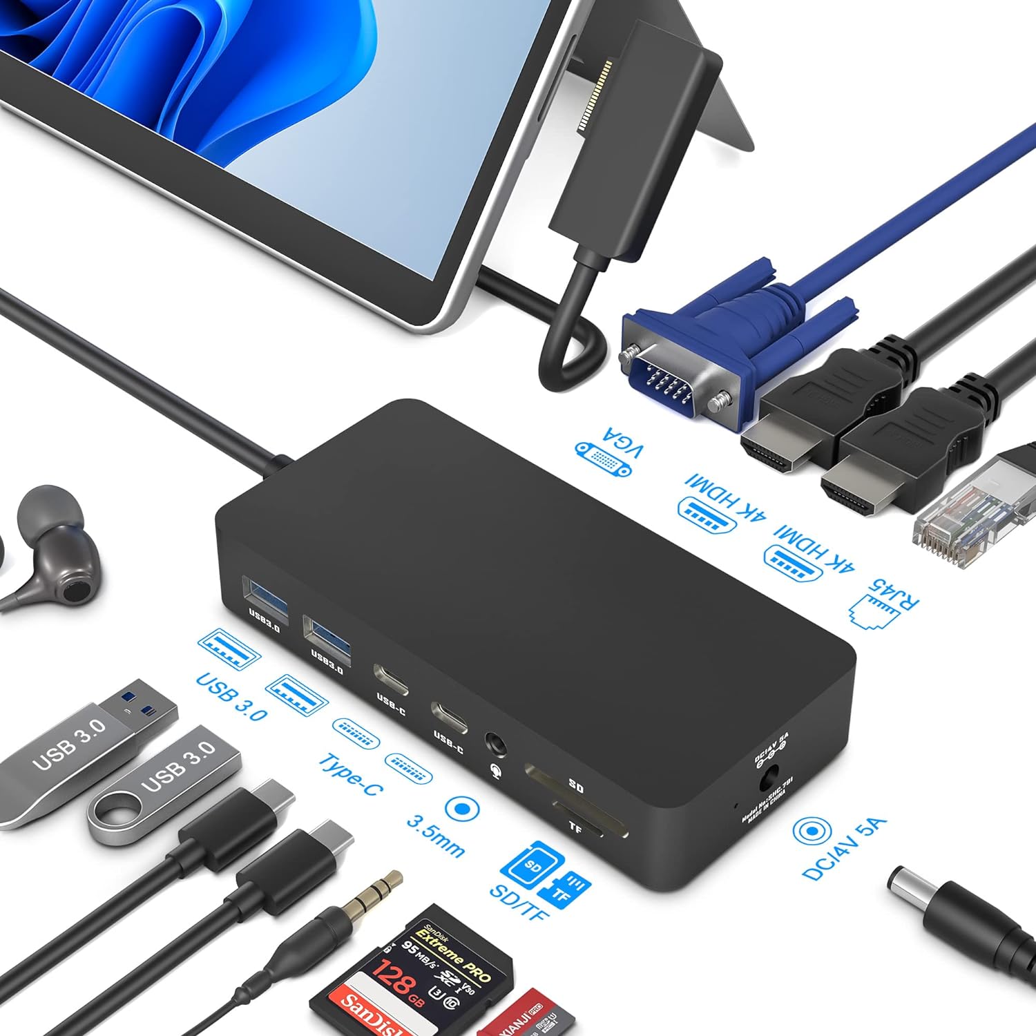 Док-станція Surface використовує технологію Surface Connection і має до 12 портів, тому ви можете підключити майже всі свої пристрої через одну док-станцію; який забезпечує швидку передачу відео, аудіо та даних, підтримує порядок на робочому столі. Док-станція Microsoft Surface 12 в 1 оснащена 2 портами HDMI 4K, портом VGA, портом RJ45, 2 портами даних USB C, 2 портами USB 3.0, слотом для карт SD/TF Micro SD, роз’ємом для навушників 3,5 мм.