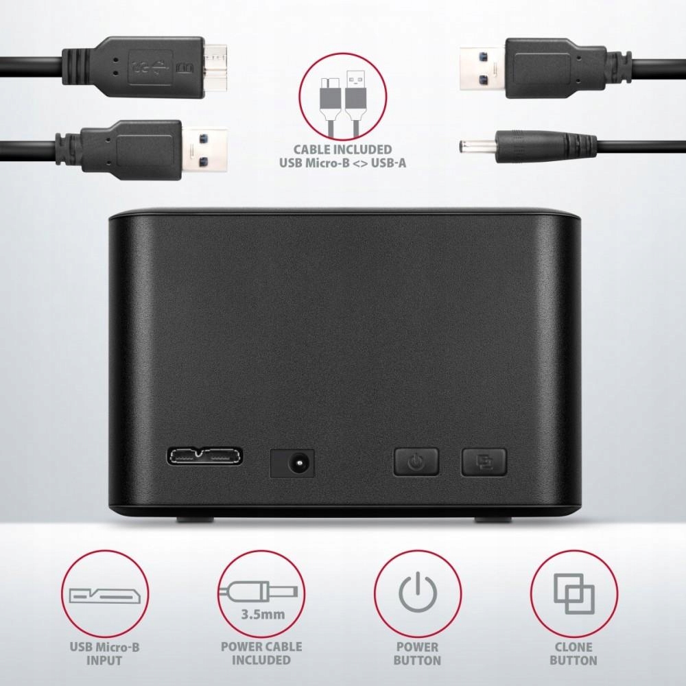 SuperSpeed USB 5 Gbps AXAGON ADSA-D25 CLONE MINI док-станція/станція для клонування - легко та швидко підключіть до комп'ютера два накопичувачі 2,5" одночасно. Підключення до комп'ютера можливе через роз'єм USB Micro-B в док-станцію разом із USB-кабелем USB Micro-B -A, що входить до комплекту.
