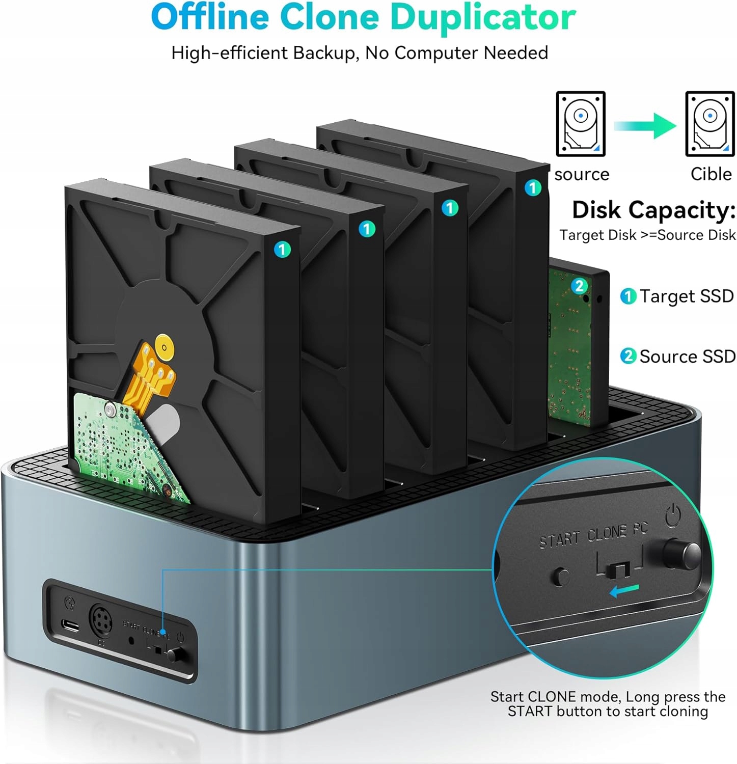 - Копіювання в автономному режимі: док-станція для жорсткого диска з 5 відсіками підтримує автономне клонування жорсткого диска для копіювання оригінального диска на цільовий диск. Ця функція захищає ваші конфіденційні дані, запобігає мережевим атакам і раптово відключає вас від Інтернету. Примітка. Поміняти положення диска та цільового диска неможливо.