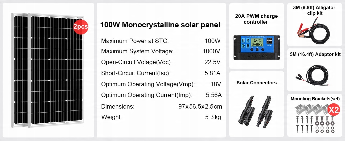 DOKIO Panel słoneczny 100 W, 2 szt. (200 W), 18 V, monokrystaliczny