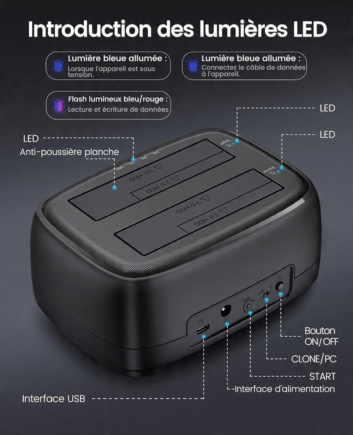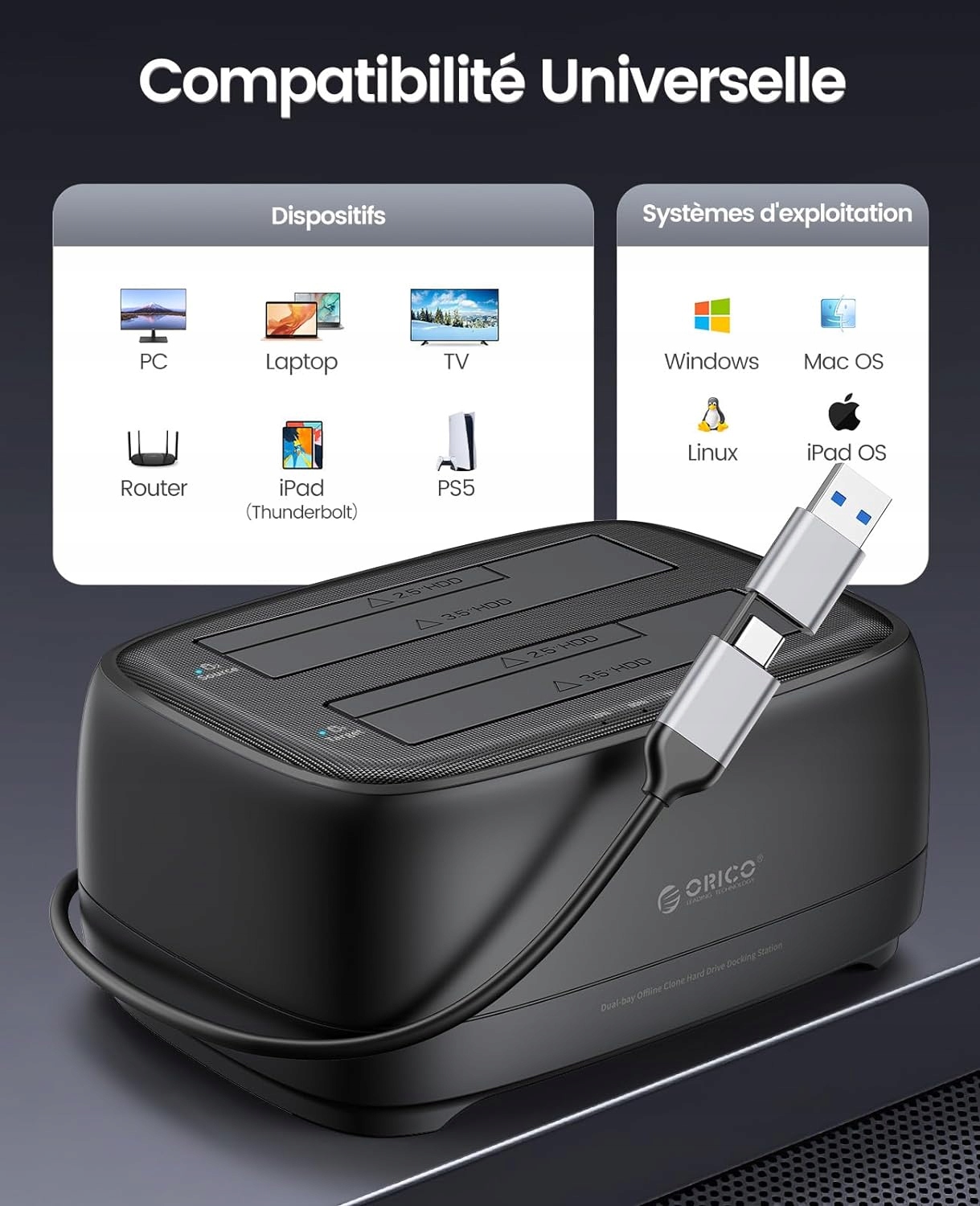 Сумісність із Windows, Mac, Linux, Android та різними пристроями, такими як ПК, ноутбуки, ігрові консолі, телевізори Smart TV, маршрутизатори та смартфони (потрібна функція OTG). 3,28-футовий кабель даних 2-в-1 USB C – D/A забезпечує сумісність док-станції жорсткого диска з пристроями USB-C і USB-A.