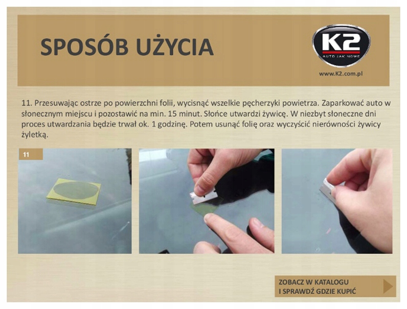 Унікальна система нанесення повністю усуває частинки повітря, що залишаються в тріщині, і заповнює її спеціальним зв’язуючим, що з’єднується зі склом. Смола твердне під впливом сонячних променів. Зрештою, продукт набуває абсолютно прозорої форми, що робить місце ремонту непомітним.
