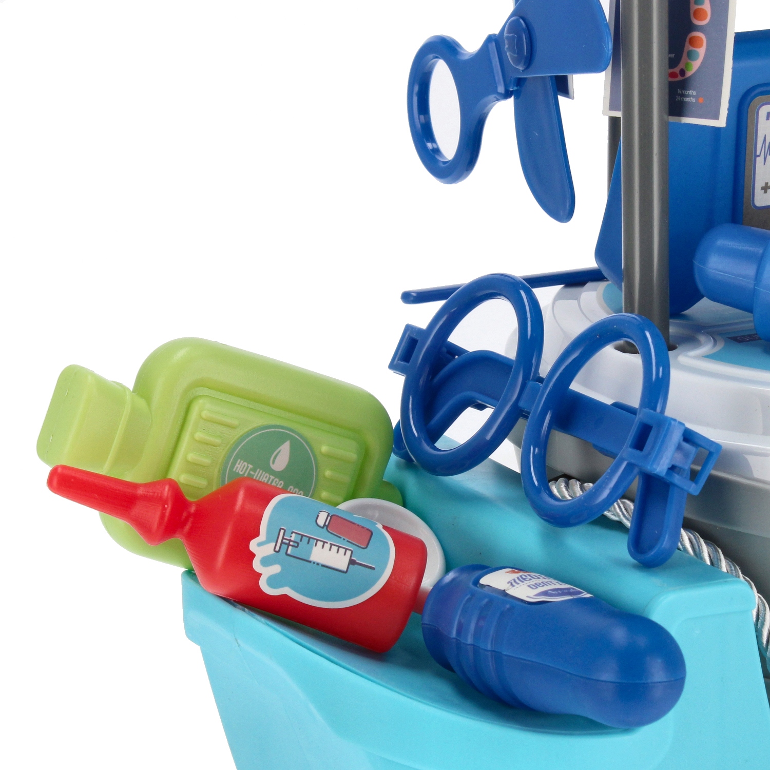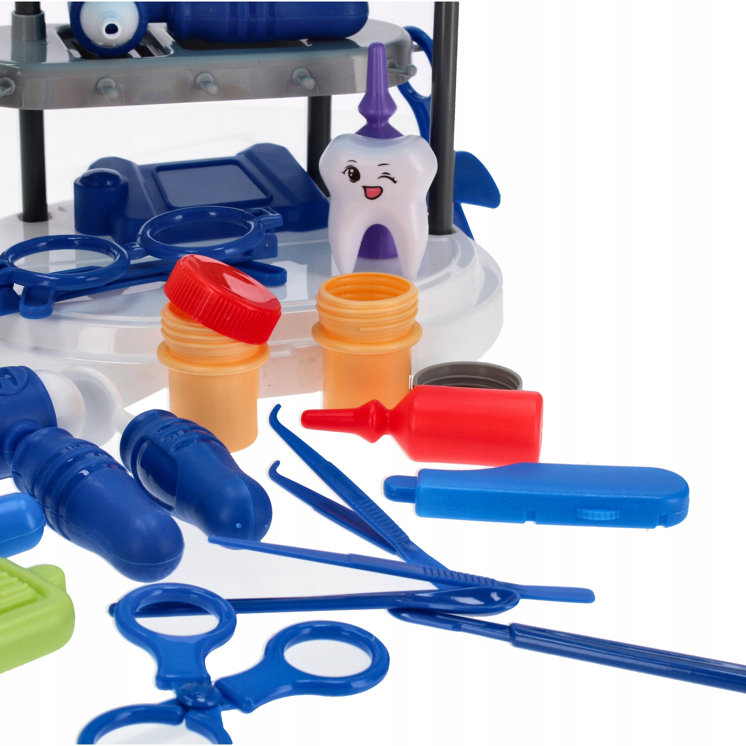 Продукт переваги: розвиток уяви дитини, навчання догляду за хворими, набір упакований у зручну валізу, має коліщатка, набір також можна носити в кошику, шнурки служать ручкою, доступний у синьому кольорі. сірий колір.