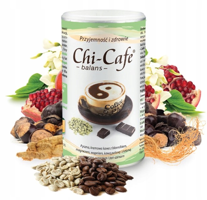 Секрет балансу Chi-Cafe полягає в гармонійній композиції зелені та смаженого розчинна кава, баластні речовини клітковини акації, магній, кальцій, а також гуарана, гранат, женьшень і какао.