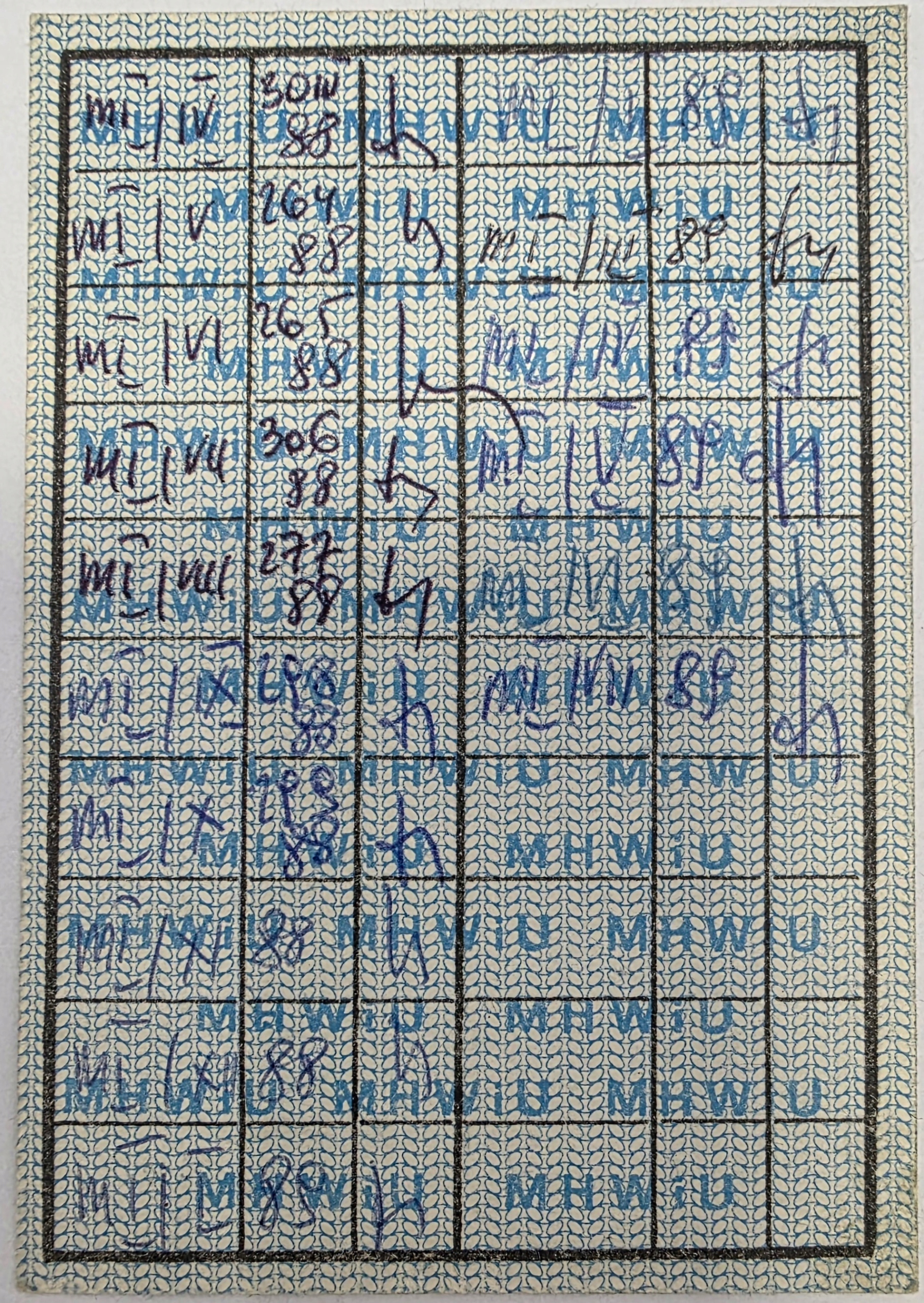 Стан: документ використаний, рукописний ручкою, з видимими датами з кінця 1980-х років (наприклад, 1987, 1988). Папір пожовклий, має сліди використання, складки та штампи, типові для старих колекційних експонатів.