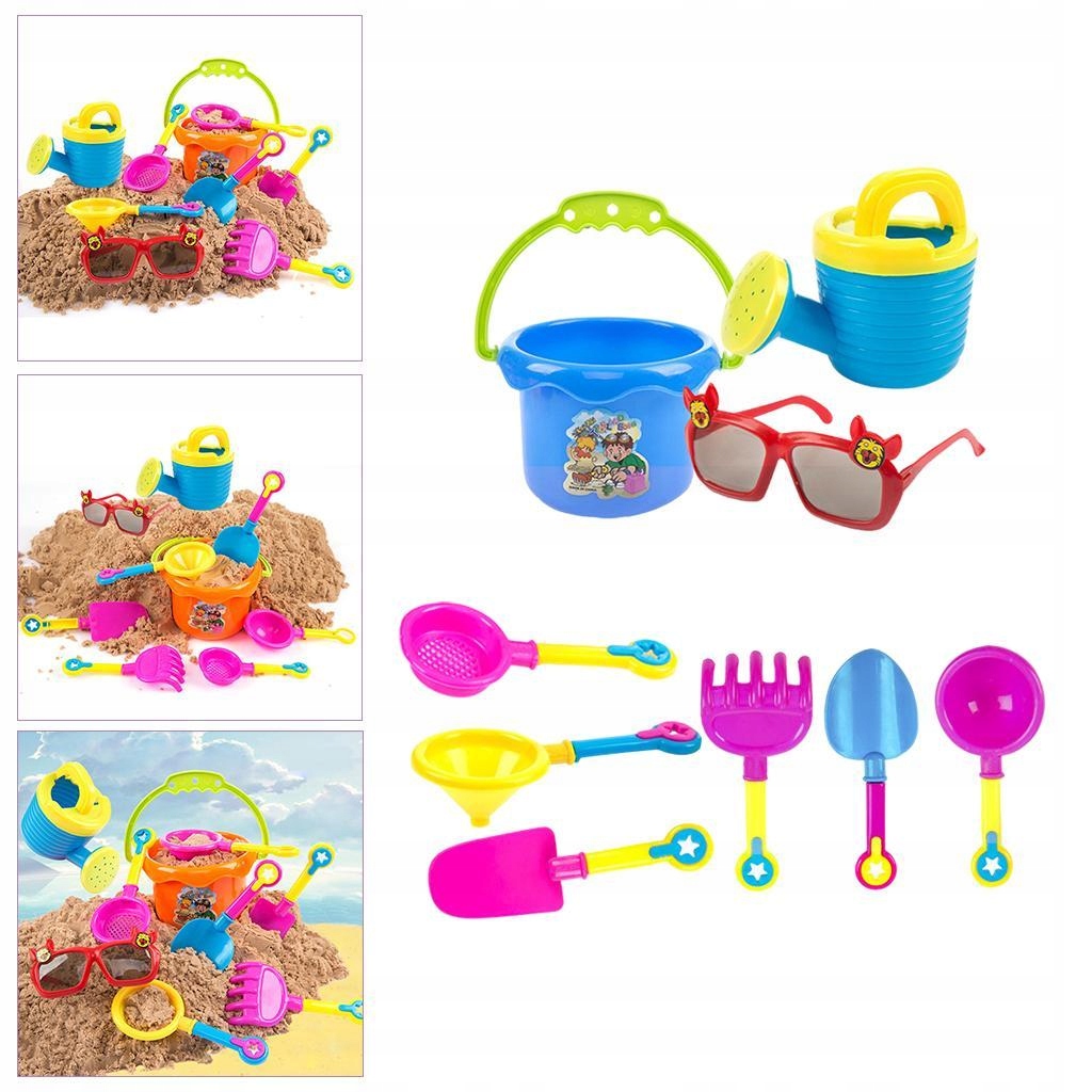 Набір із 9 пляжних іграшок, включаючи 1x відро, 1x граблі для піску, 1x круглу гостру лопату, 1x лопату з широким горлом, 1x сито для піску, 1x конусний фільтр, 1x круглу ложку, 1x лійка, 1x окуляри (без лінз), щоб діти насолоджувалися пляжем на відкритому повітрі/в приміщенні.