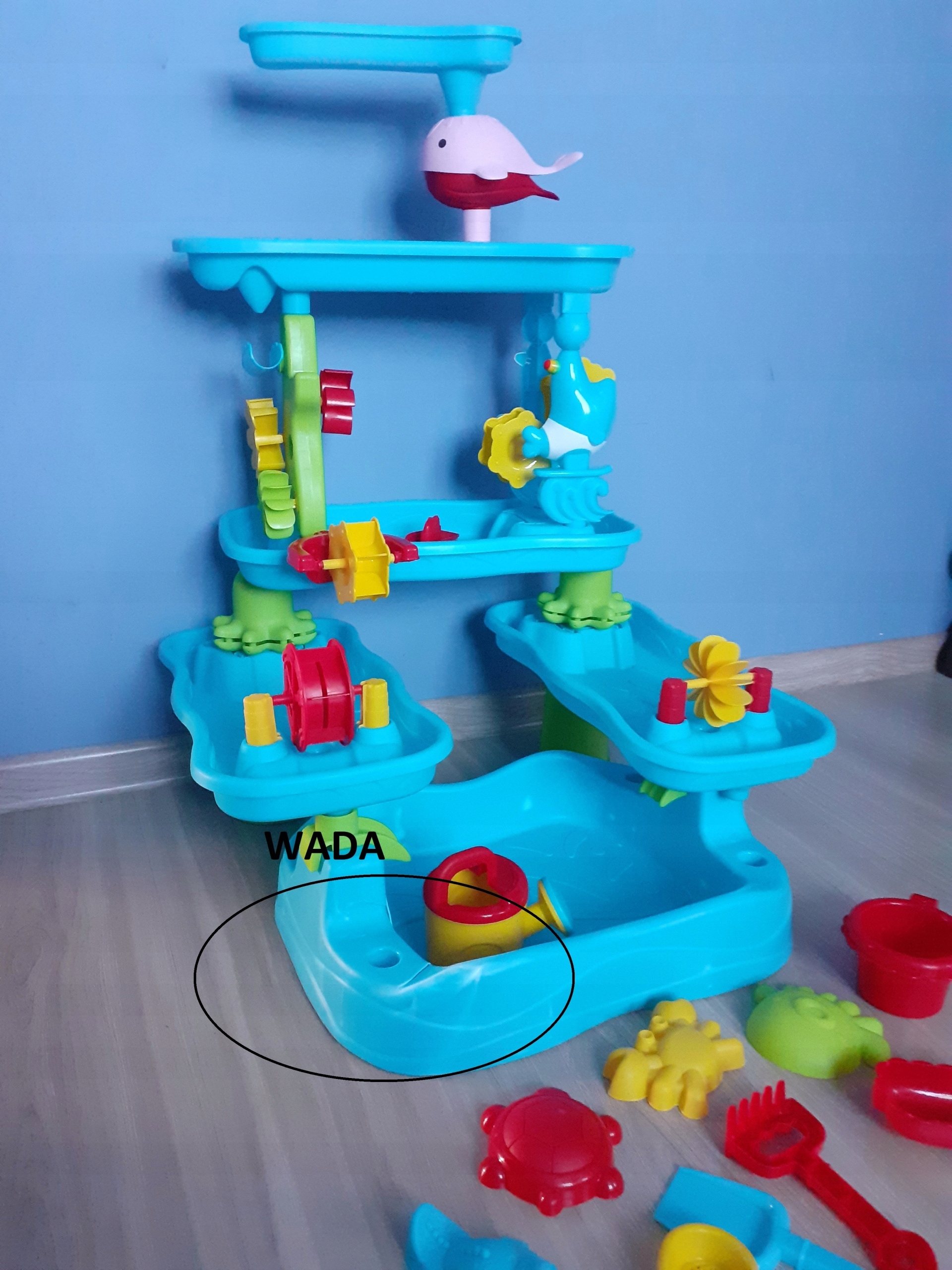 - Пляжний столик із багатими аксесуарами: водний ігровий столик створює фантастичне королівство для дітей. Набір водних іграшок містить аксесуари, зокрема воронки для дельфінів, водяний вітряк, вежу на дереві, човен, лійку, лопатку, ложку, граблі, ситечко, невелике відерце, піщану форму для краба та крокодила.