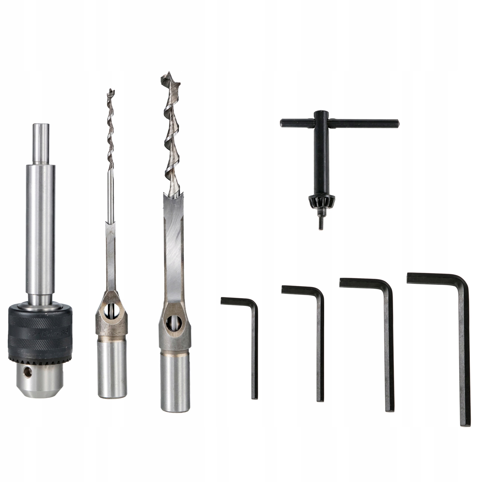 Цей деревообробний верстат для довбування містить 13-міліметровий свердлильний патрон зі стійким свердлом, шип 3/8, тримач зубила, ключ для встановлення затискача свердла та чотири шестигранні ключі .