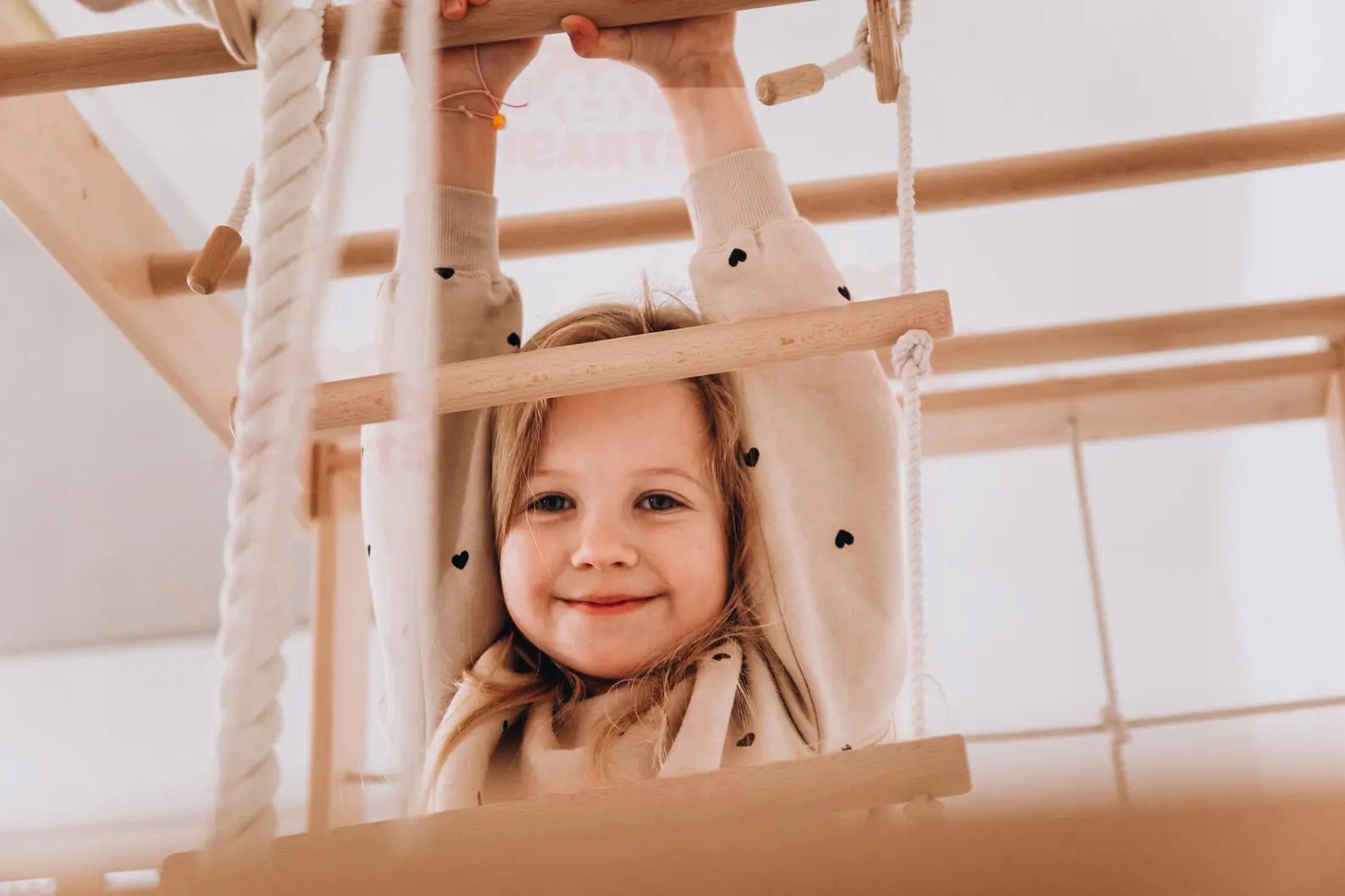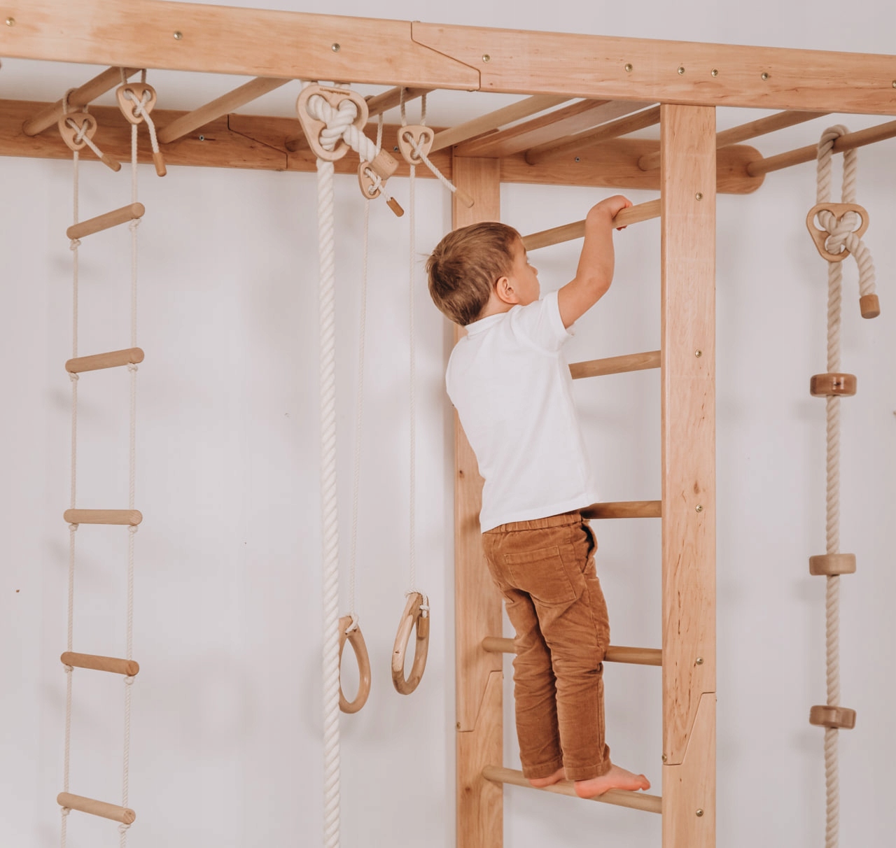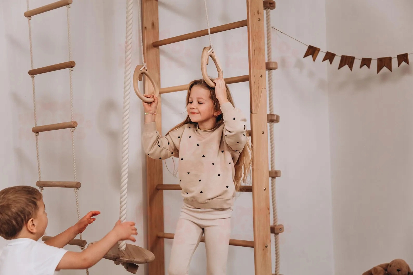 Дерев'яний майданчик для дітей Bridge з повним набором спортивних аксесуарів доповнить обладнання кожної дитячої кімнати та створить умови для щоденних тренувань та ігор.