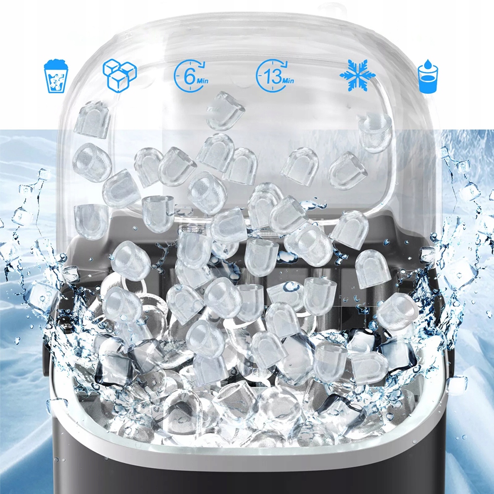 - Швидка льодова машина Компактна крижана машина виробляє 9 кубиків льоду у формі куль лише за 6 хвилин. Протягом 24 годин це буде 12 кг.