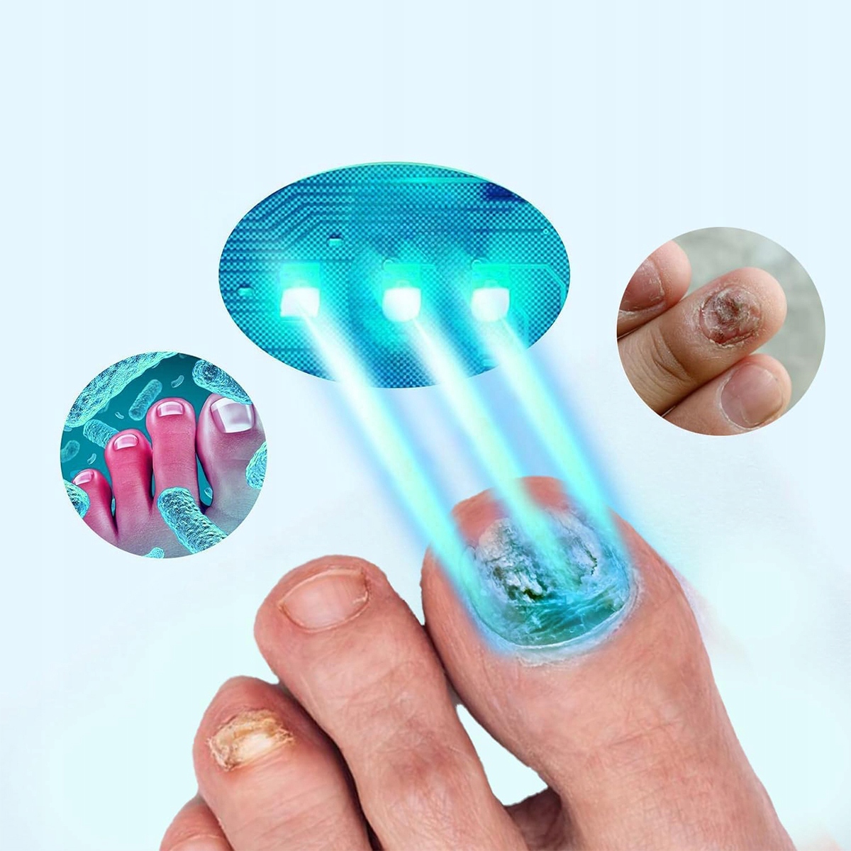 【Ультрафіолетова терапія】Лазерний пристрій для лікування грибка використовує інфрачервоне світло з довжиною довжини 405 нм і синє ультрафіолетове світло з довжиною довжини 365 нм, щоб проникати в тканину нігтя та шкіру, досягати ділянки, де локалізується грибок, і механічно пошкоджувати грибок, внаслідок чого грибок втрачає здатність до розмноження, таким чином допомагаючи відновити здорові нігті.