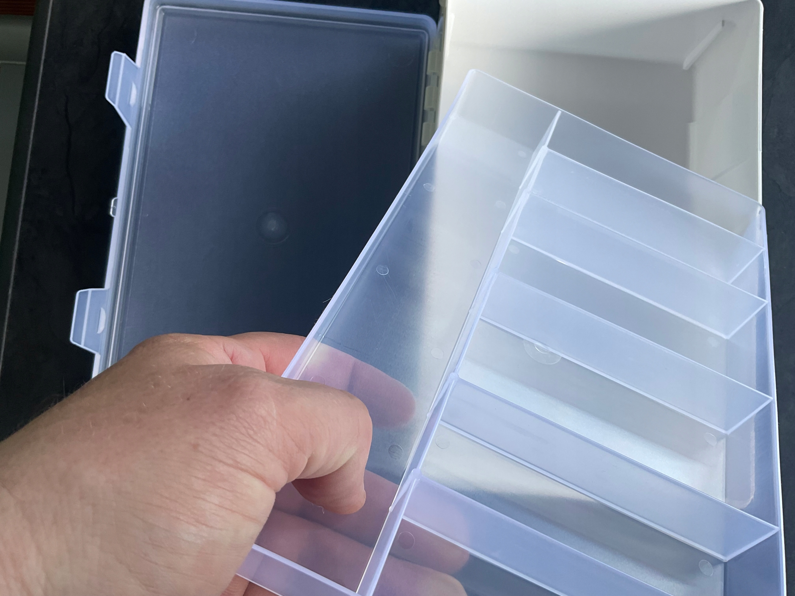 Контейнер для медичного приладдя з вкладишем, розділеним на 7 частин. Обкладинка закрита двома кліпсами