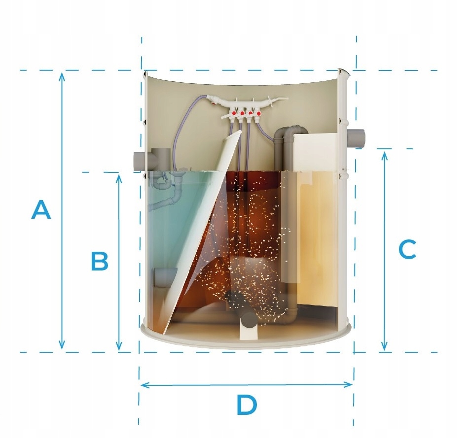 У резервуарі немає живих пристроїв. Усі функції, пов’язані з аерацією та перекачуванням стічних вод та активного мулу, здійснюються через