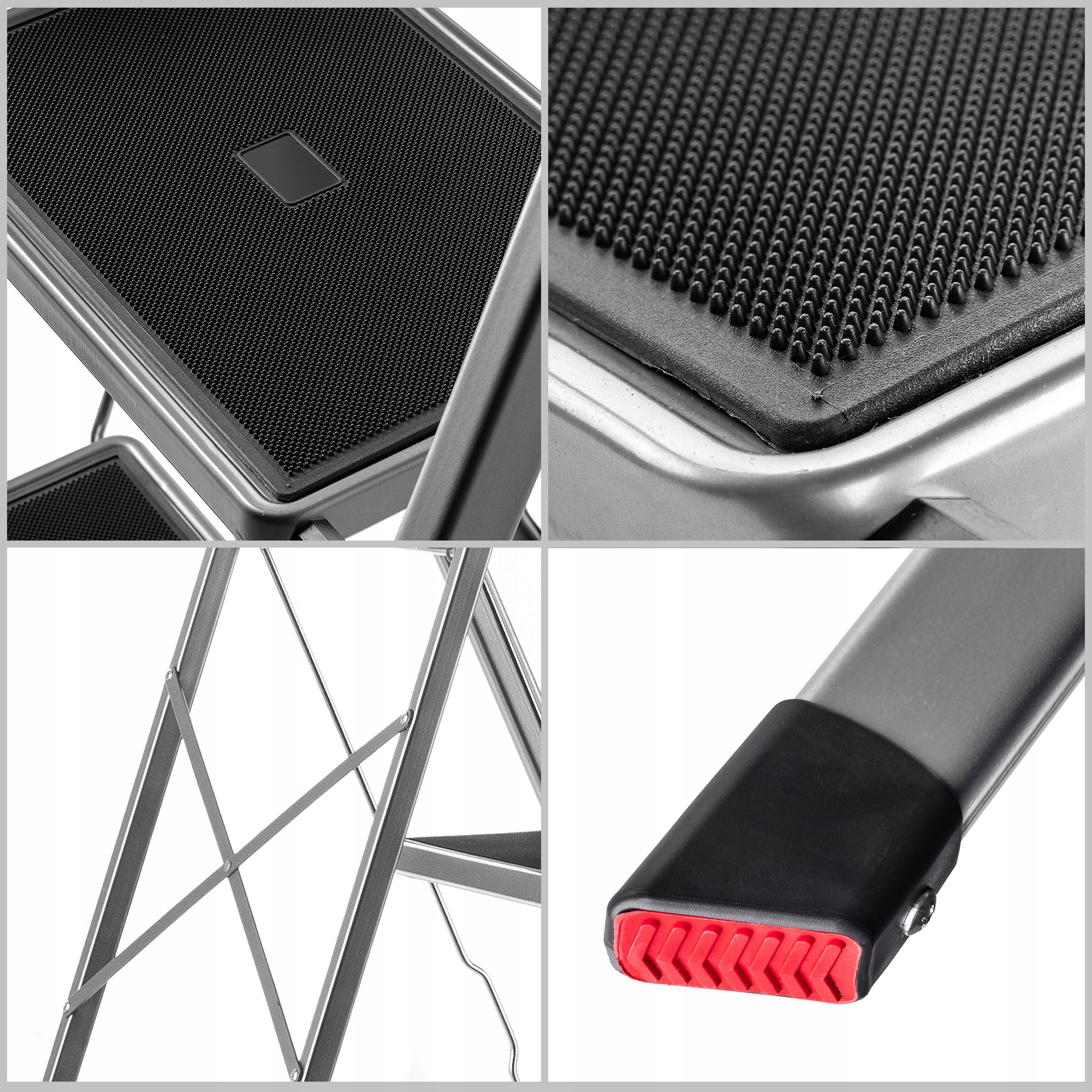 ✅БЕЗПЕКА - складна сталева драбина має нековзкі ніжки b> що забезпечує його стійкість і захищає підлогу від подряпин. Оснащенийширокими сходинками з неслизьким килимком і зручною ручкоющо захищає від падіння.