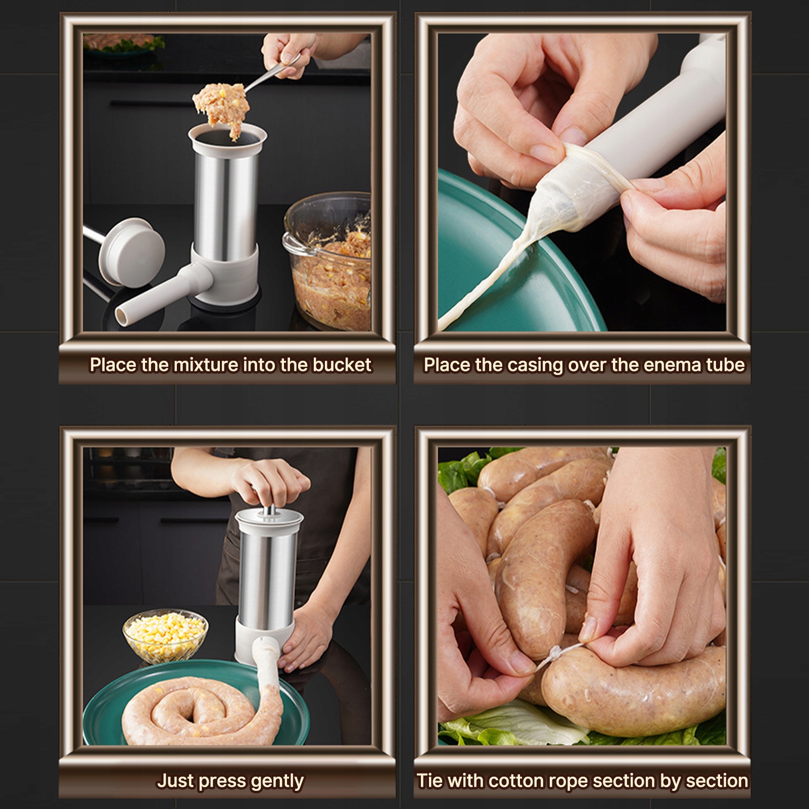 3. 【Велика ємність】1,5 л/3,3 фунта ковбасниця, яка може приготувати набагато більше ковбас за один раз. І він підходить не лише для ковбаси, а й для приготування хот-догів, братвурстів, м’ясного пресу тощо.