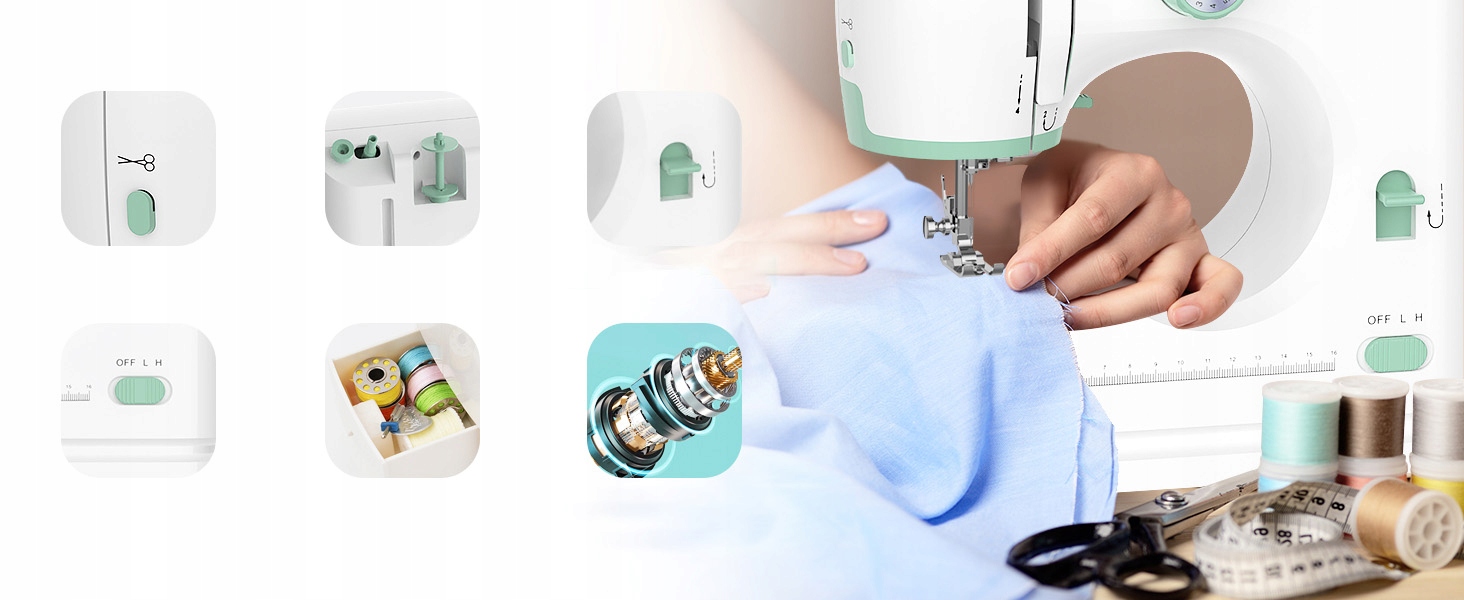 Домашня швейна машина з кнопковим перемикачем і педальним перемикачем, ви можете вибрати відповідно до ситуації використання; Швейний хвіст можна посилити, щоб забезпечити відсутність вільних країв і міцніше шиття; Світлодіодний робочий світильник колбового типу; Швейна машинка з ниткорізом, не потрібно використовувати ножиці, економить час; Функція обмотування ниткою, зручна для обмотування бобінної нитки.