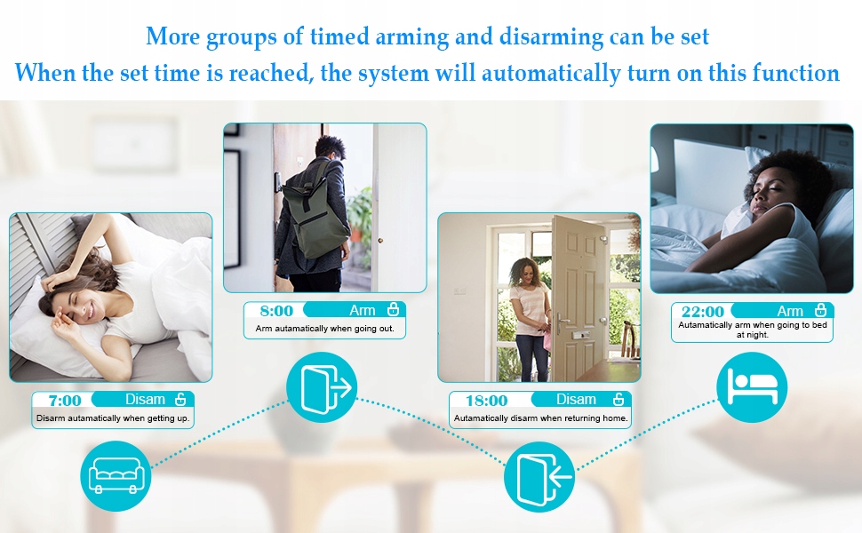 У програмі ви можете встановити час початку для постановки під охорону, зняття з охорони, постановки під охорону вдома, SOS та інших функцій. Після досягнення встановленого часу система автоматично активує цю функцію. Можна встановити понад 20 груп функцій часу.