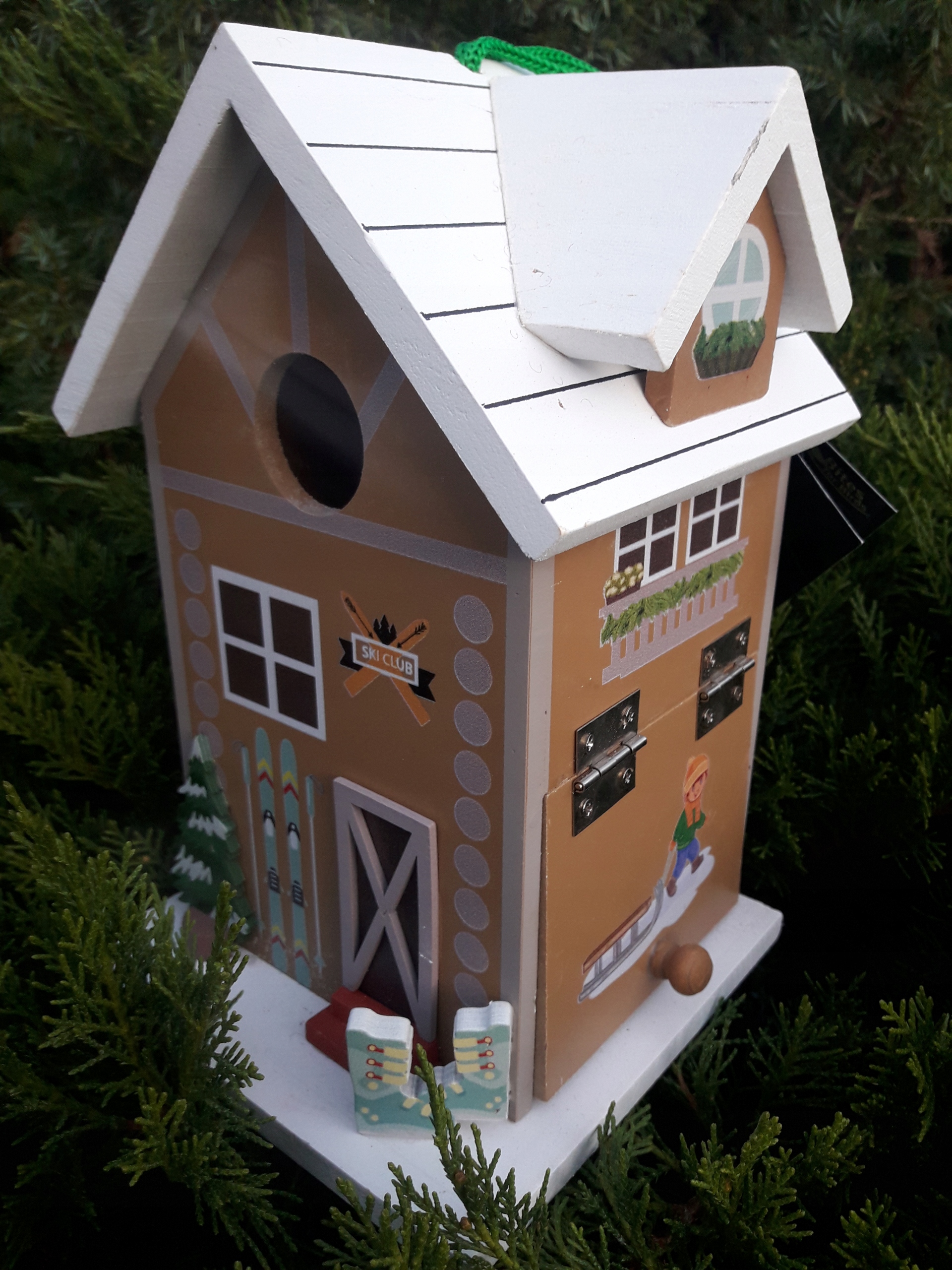 Будиночок оснащений шнурком для підвішування, отвором для входу для птахів і дуже практичними дверцятами, які при необхідності можна відкрити напрочинені, щоб легко дістатися всередині та прибрати будинок, або розсипати їжу для мешканців.